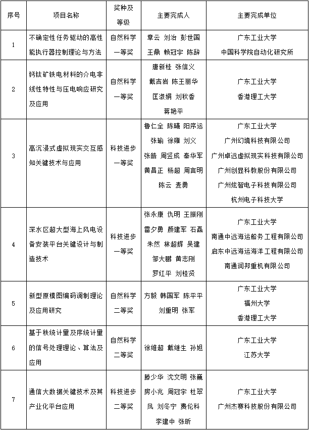 此外,我校参与合作完成的成果“跨域多维电子围网关键技术及应用”获广东省科技进步一等奖;“卫生洁具高效生产的机器人集成智能产线关键技术与应用”“车用高导热基材和高端印制板关键技术研究及应用”“高速公路智能交通大数据关键技术及应用”“基于岩溶发育机理的碳酸盐岩分布区地质调查及塌陷预警关键技术”“药物重要杂环中间体关键技术研究及其产业化示范”获广东省科技进步二等奖。