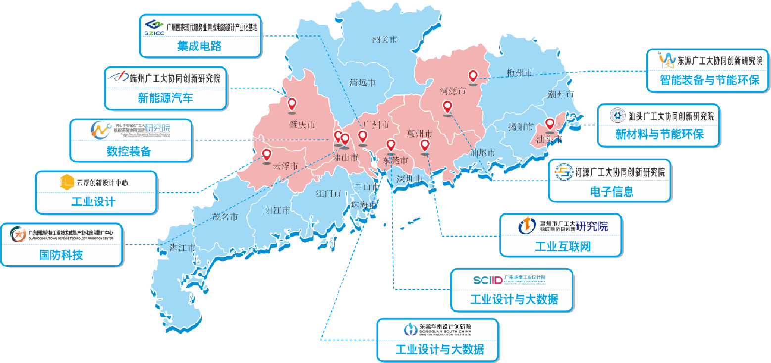 广工始终坚持与产业深度融合。在佛山、广州、东莞、汕头、惠州、河源等地,广工与地方政府和工业界联合共建了佛山数控装备研究院等11个“造血式”重大协同创新平台,服务企业6000多家,构建了“点-线-面”立体式产业服务体系。