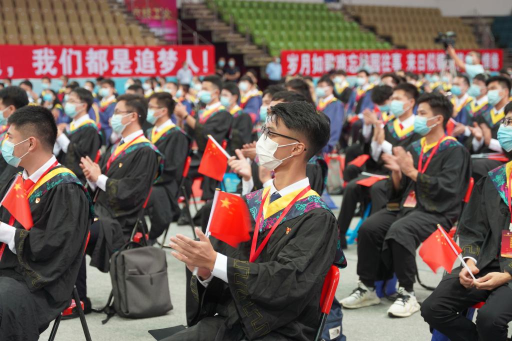 从党的十九大到改革开放40周年,再到新中国成立70周年,校长邱学青带领同学们回顾了不平凡的四年和学校快速发展所取得的显著成绩。对于同学们全过程参与了学校高水平大学建设,邱学青说:“你们的思想政治素质、创新能力、实践技能和社会责任感显著增强,成就了不一样的自己。”尤其是面对新冠疫情,邱学青对同学们以“狭路相逢勇者胜”的精神与姿态,奋力“战”疫,顺利完成了学业表示赞赏。
