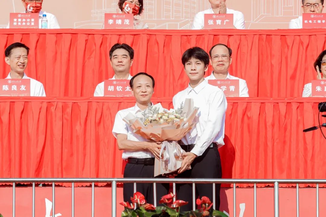 艺术与设计学院2022级学生王子瀚分享了选择广工的初心,并代表本科新生向教师代表余向阳献花致谢。王子瀚与同学们共勉:“让我们紧跟老师的步伐,在广泛涉猎的基础上,做深、做实、做细,成为厚基础、强能力、高素质的创新型和应用型人才,一起奋斗出最美好的青春,为学校建设高水平创新型大学贡献新生力量!”