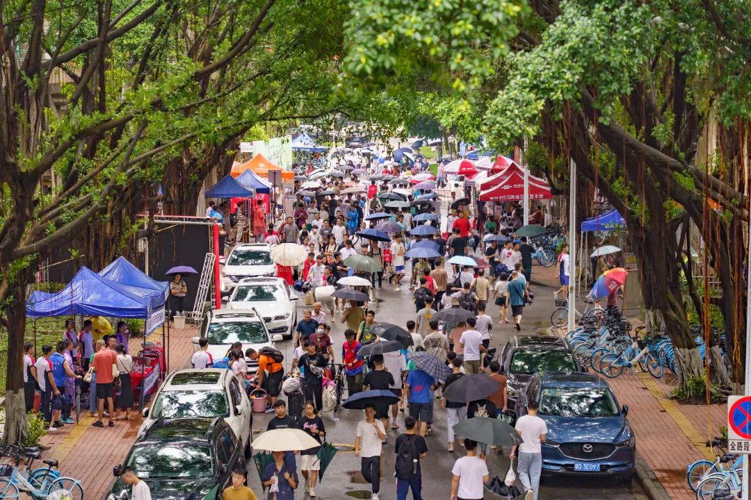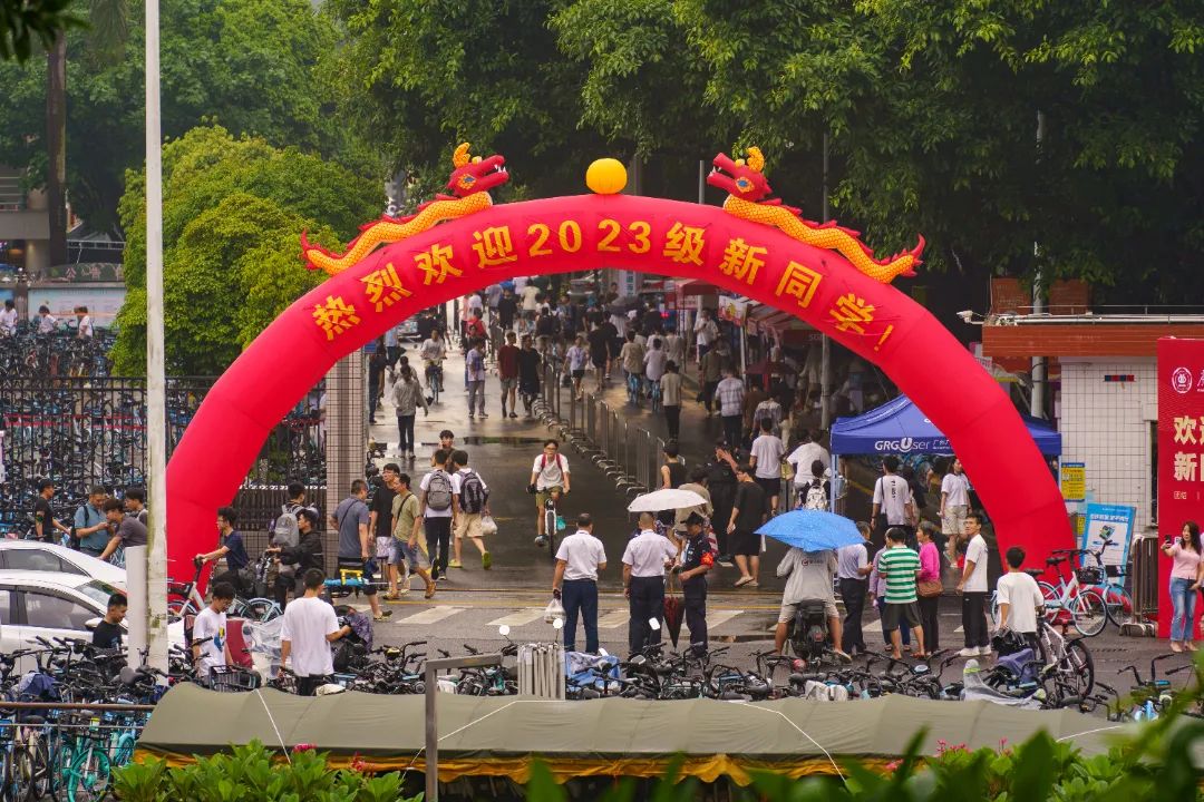 淅沥沥的雨阻挡不住“心”与“新”的双向奔赴,车流、人潮,雨中的广工热闹非凡。