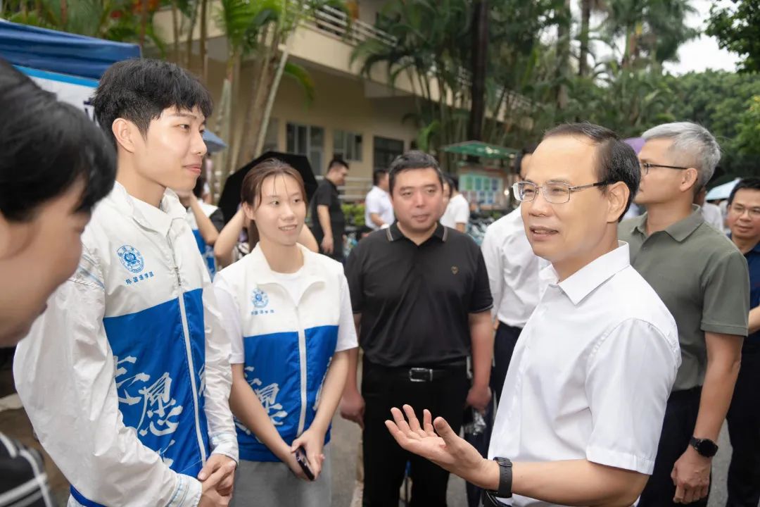 时值台风“苏拉”影响,天空飘雨,胡钦太到学院迎新站点了解新生到校情况、报到程序等,与志愿者和工作人员亲切交谈。感谢他们的辛勤付出,叮嘱他们要注意安全,以饱满的热情迎接新生,体现广工人的精气神。胡钦太表示,学校为应对台风做了充分准备,因时因势灵活调整措施,确保每一位新生安心顺利报到入学。