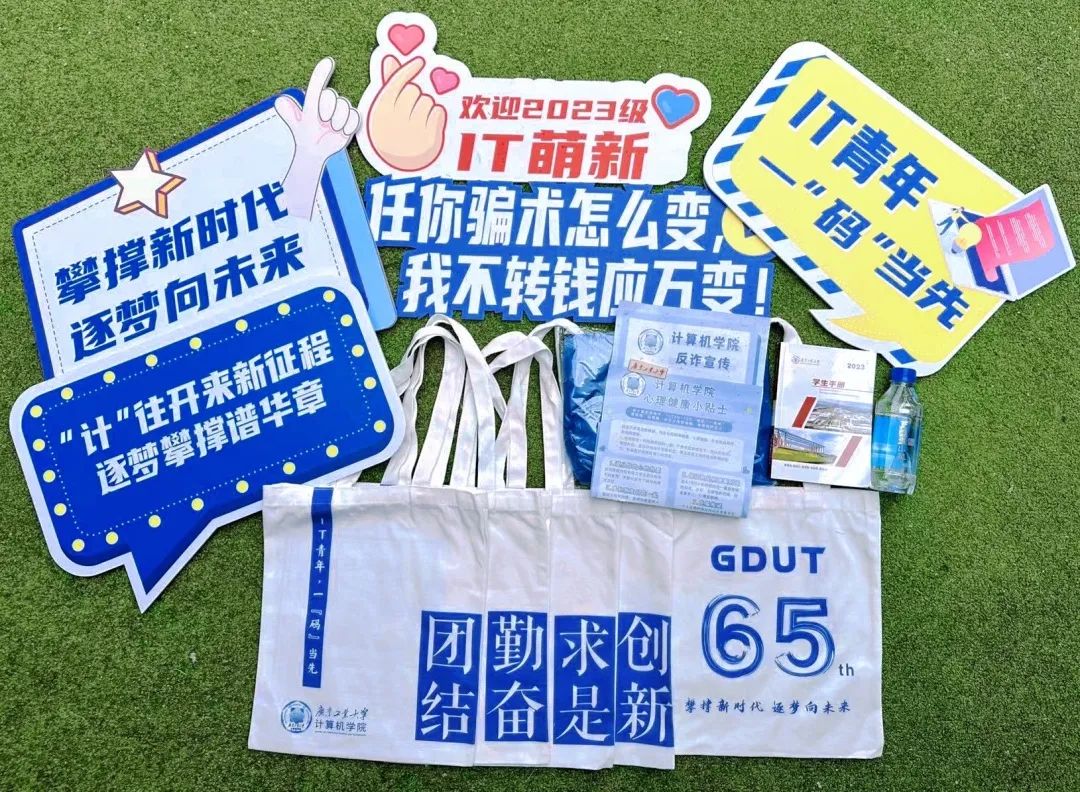 计算机学院为新生们精心准备了专属帆布袋、学生手册、防诈指南、心理贴士、雨衣等迎新包。值得一提的是,帆布袋是学院结合学校庆祝本科办学65周年,以校训“团结 勤奋 求是 创新”为主题精心设计的四种款式,寓意IT萌新能秉承校训精神,在广工谱写新时代的青春之歌。