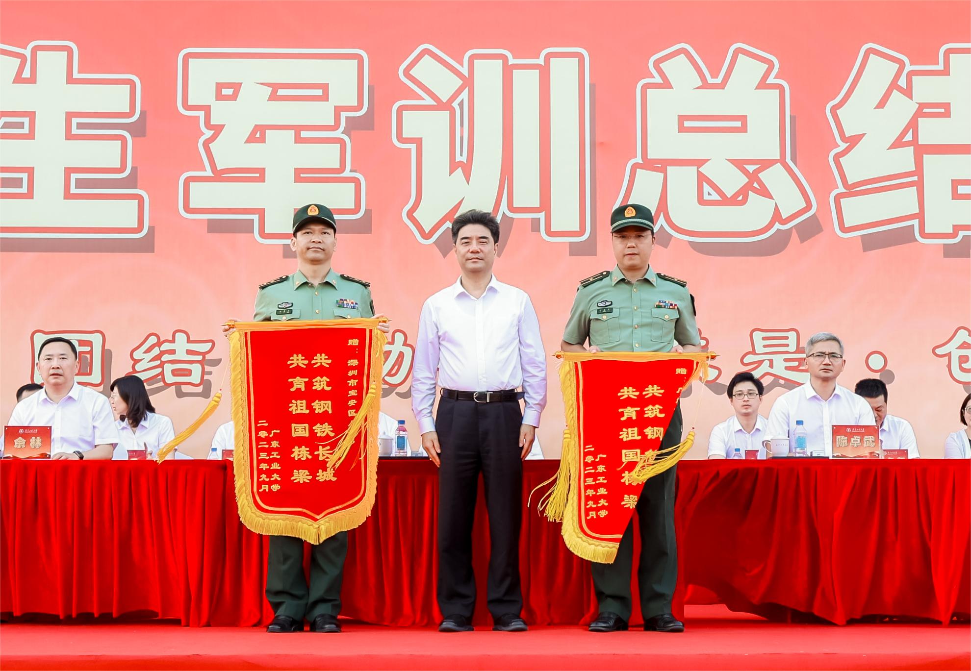 “逐梦新征程,攀撑创未来。站在新的历史方位,广大青年学子要立志做有理想、敢担当、能吃苦、肯奋斗的新时代好青年,为全面建设社会主义现代化国家贡献青春力量!”胡钦太、邱学青、朱蔚蔚作军训总结讲话,代表学校向承担军训任务的军训教官、军训工作人员和老师们表示衷心的感谢,向圆满完成军训任务的2023级全体本科生表示祝贺。并寄语同学们要坚定理想信念,永葆家国情怀不褪色;要发扬优良传统,坚持修身立德不变质;要练就过硬本领,接续团结奋斗不松懈,在“请党放心,强国有我”的时代号召下,在“团结、勤奋、求是、创新”的校训引领下,在“逐梦攀撑”的广工精神激励下,勇担时代重任,不负青春韶华,做有理想、敢担当、能吃苦、肯奋斗的新时代好青年,以更加优异的成绩迎接学校本科办学65周年,让青春在全面建设社会主义现代化国家的火热实践中绽放绚丽之花!
