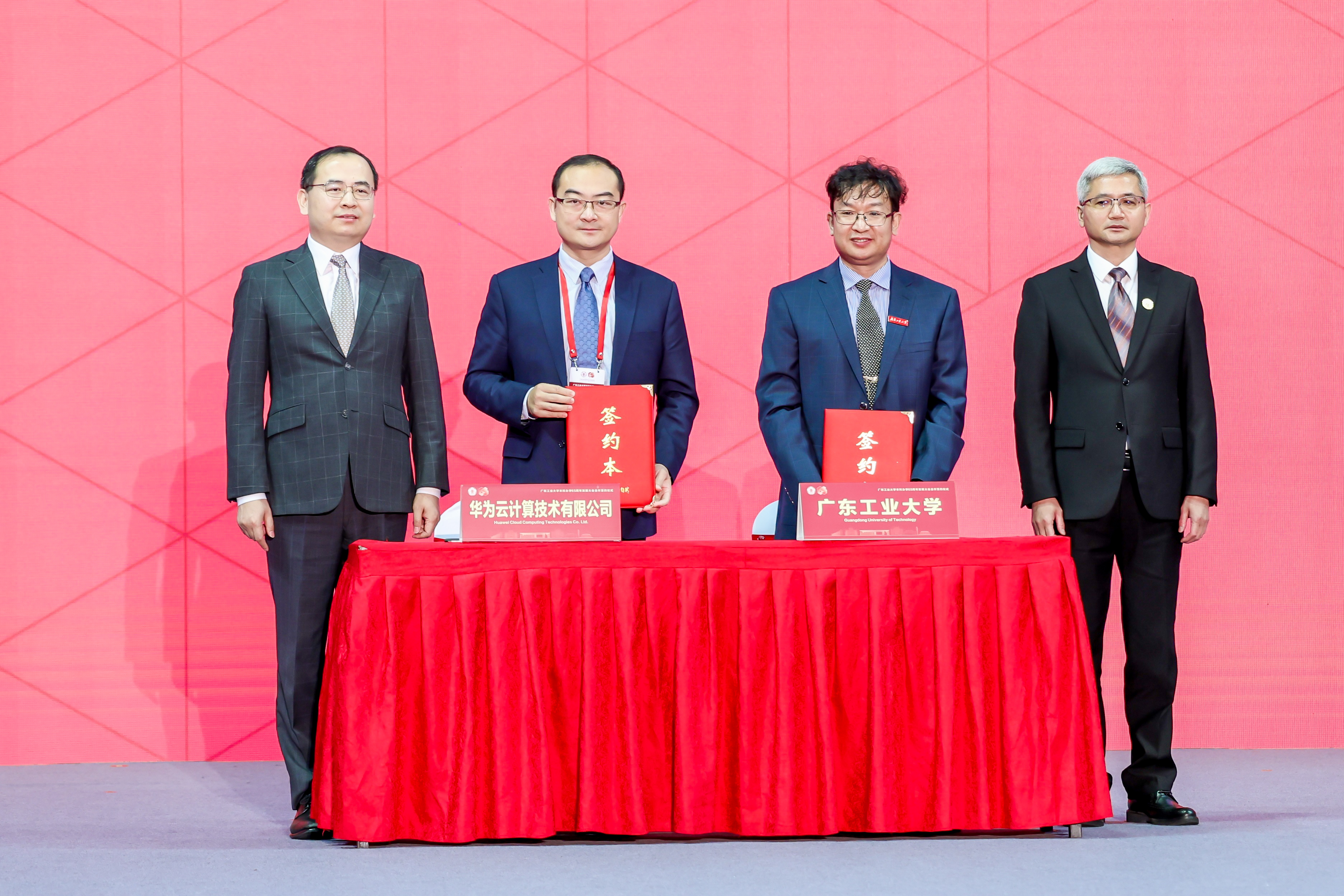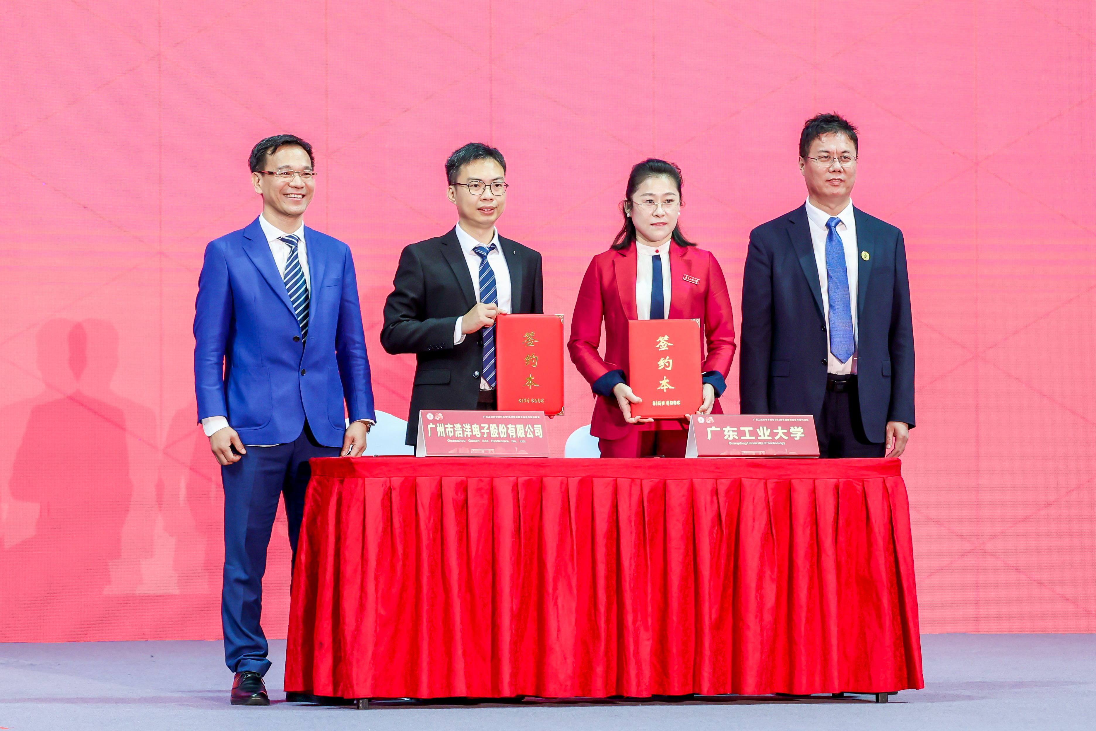 学校党委副书记陈卓武,党委常委、副校长王振友,卢永平以及广州市浩洋电子股份有限公司董事长兼总经理蒋伟楷分别见证学校与华为云计算技术有限公司、广州市浩洋电子股份有限公司签署校企合作协议。