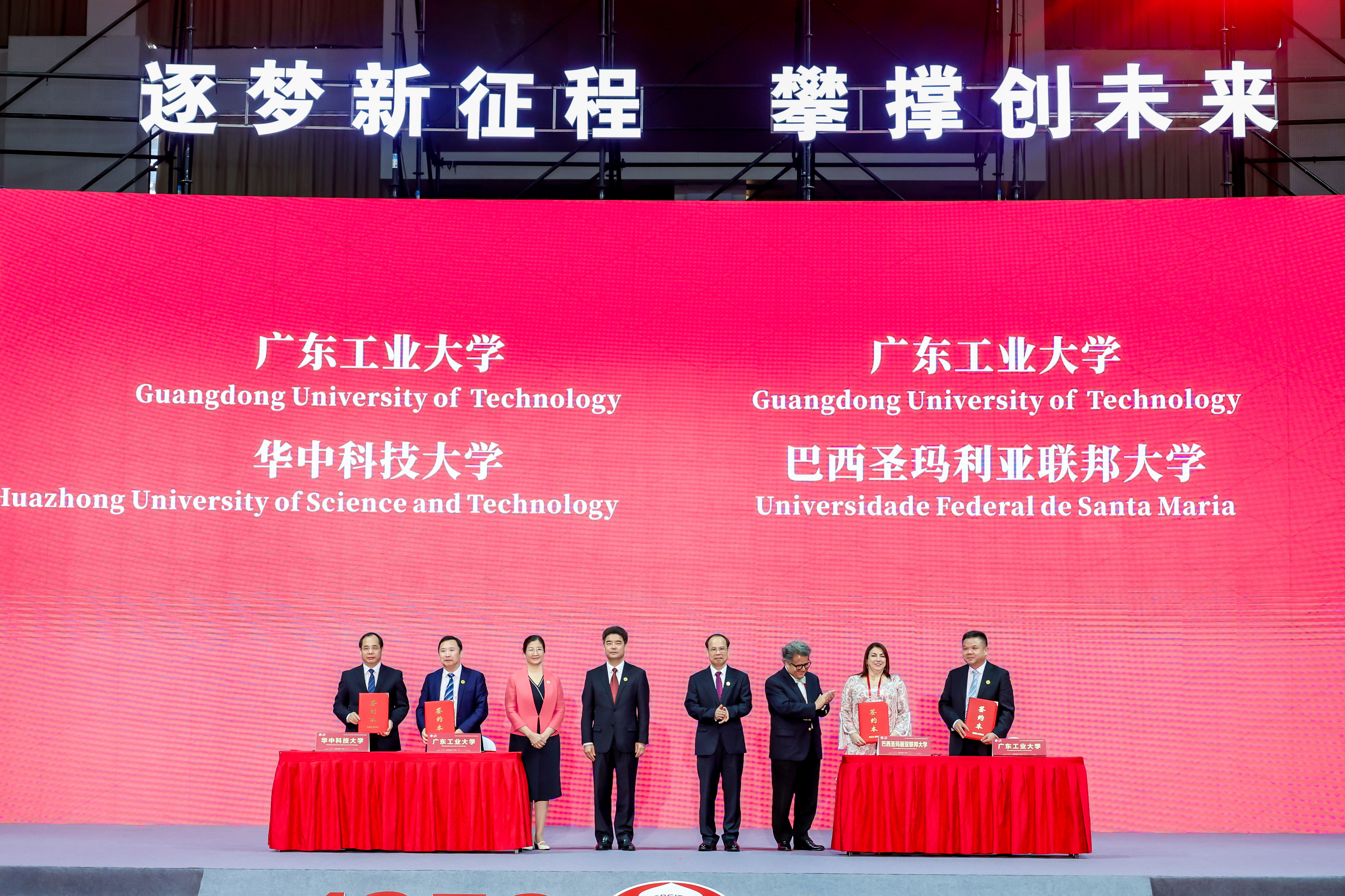 学校党委常委、副校长杜承铭,副校长余林分别与华中科技大学党委副书记张耀、巴西圣玛丽亚联邦大学副校长玛莎·博勒·阿黛梅进行校校合作签约,胡钦太、邱学青、学校党委副书记朱蔚蔚与巴西联邦共和国驻广州总领事馆总领事艾伦·科埃略·德塞洛斯共同见证仪式。