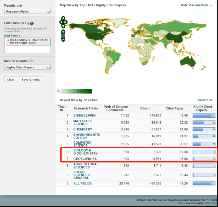据基本科学指标数据库(Essential Science Indicators,以下简称ESI)2025年3月13日最新数据显示,广工生物学与生物化学(Biology & Biochemistry),以及地球科学(Geosciences)两个学科成功跻身ESI全球排名前1%。至此,广工共有工程学、材料科学、计算机科学、化学、环境科学与生态学、农学、社会科学总论、生物学与生物化学、地球科学9个学科进入ESI全球学科排名前1%行列,其中工程学已进入前0.3‰。ESI世界综合排名633位,较上一期提升9位(位居中国内地高校第69位)。