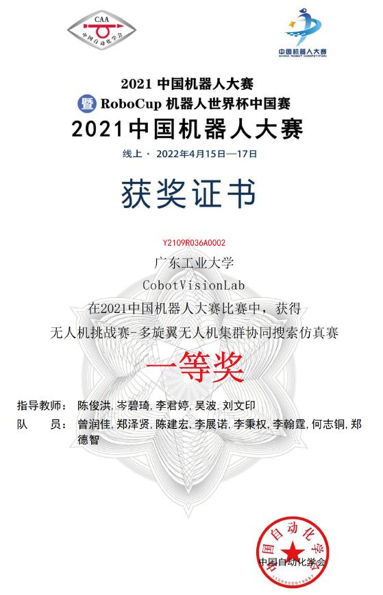 4月15-17日,2021年中国机器人大赛暨RoboCup机器人世界杯中国赛中国机器人大赛(已列入《全国普通高校学科竞赛排行榜》)总决赛落下帷幕。工大创谷入驻学生创新创业团队——CobotVisionLab团队(共融机器人视觉团队)在多旋翼无人机集群协同搜索仿真赛项中,与清华大学、军事科学院、国防科技大学等高校团队同台竞技,最终以64.4秒的比赛用时斩获亚军,荣获全国一等奖。