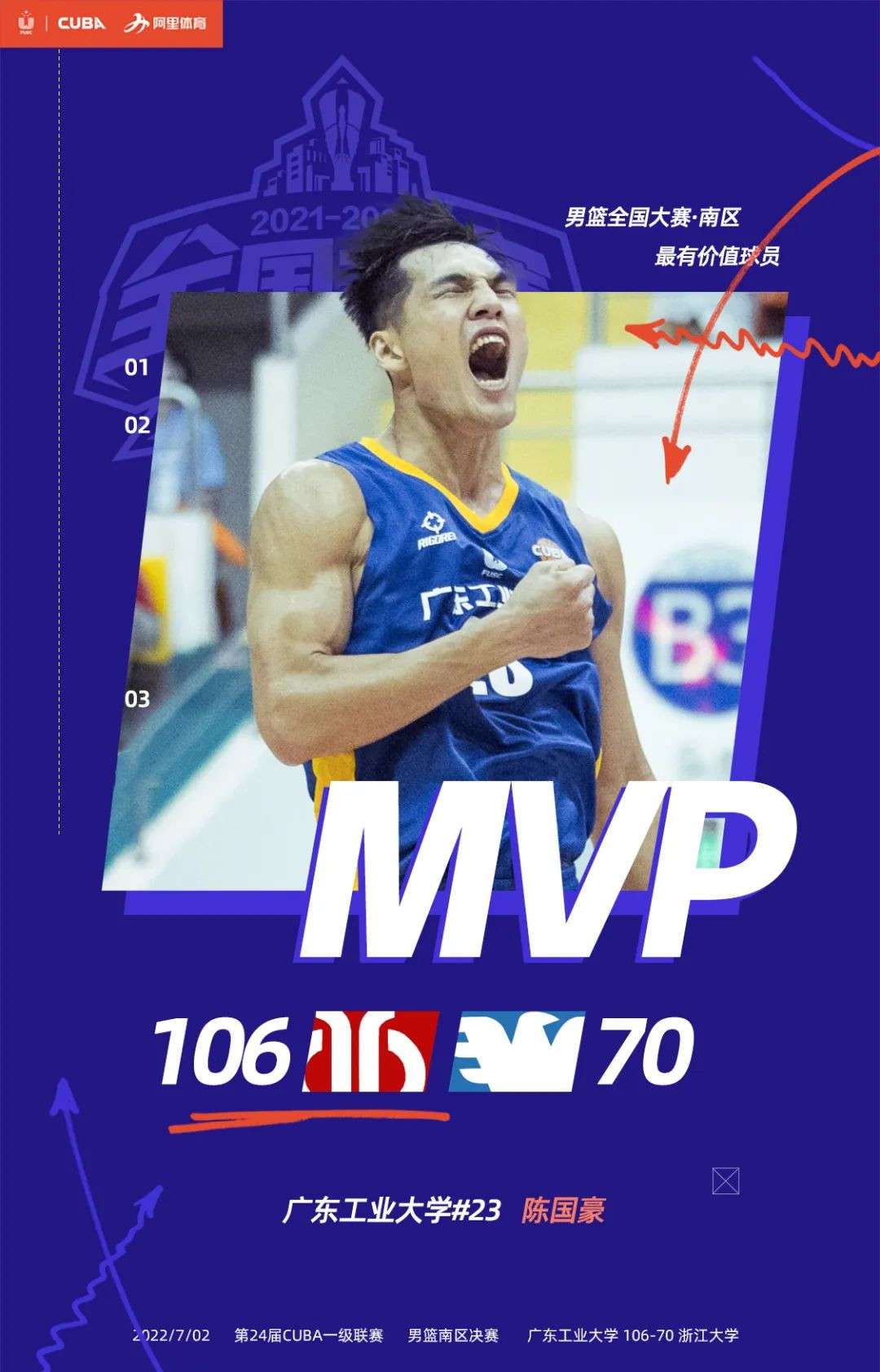 7月2日晚,在海南海口,广工男篮南区决赛会面浙大男篮,广工粤狮队以七战全胜的成绩,问鼎南区冠军!