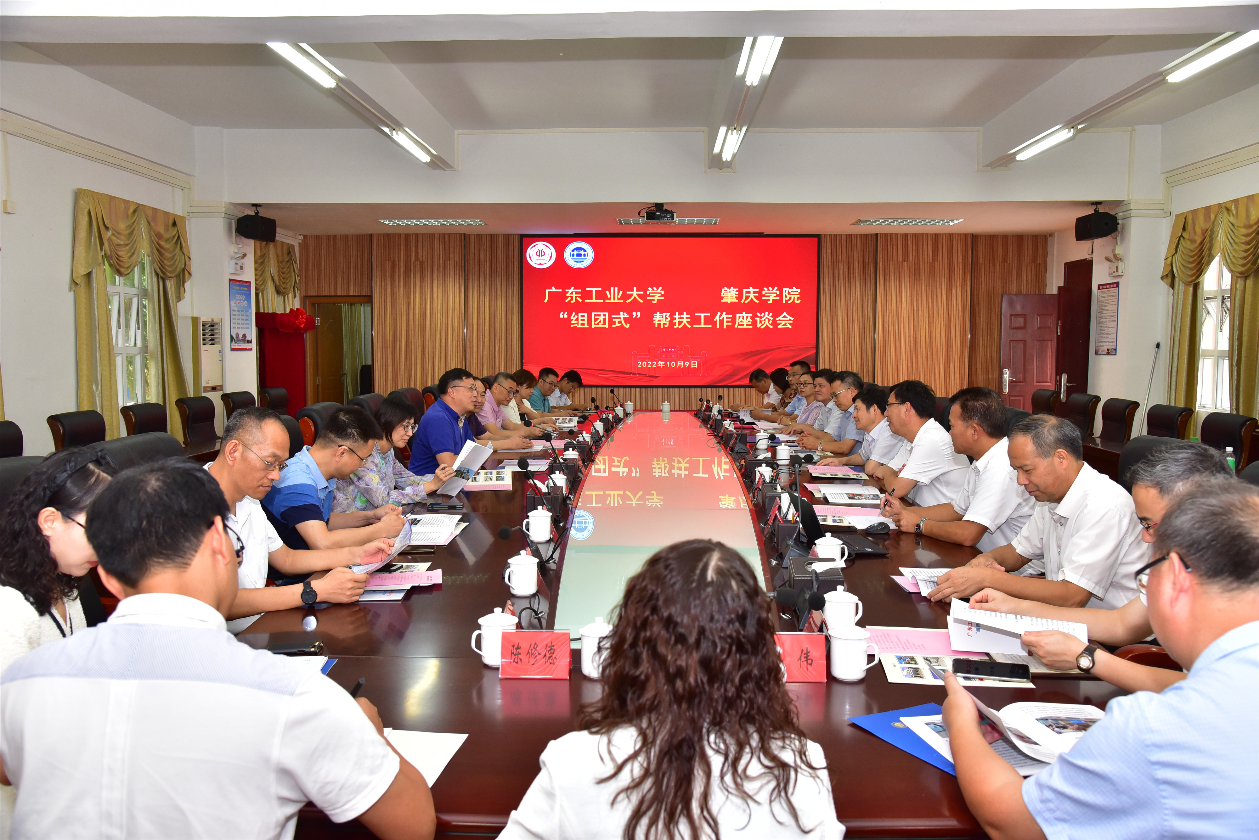 10月9日下午,学校党委常委、副校长王成勇带领相关部门负责人一行前往肇庆学院看望学校帮扶工作队,开展两校“组团式”帮扶工作交流,进一步贯彻省委组织部、省委教育工委关于高校教育人才“组团式”帮扶工作的安排和部署,落实帮扶工作方案,大力推动帮扶工作高质量发展。肇庆学院党委书记曾桓松、副校长胡文涛出席帮扶工作交流会,党委副书记谢冠华主持,全体帮扶队员和两校相关部门人员参加会议。