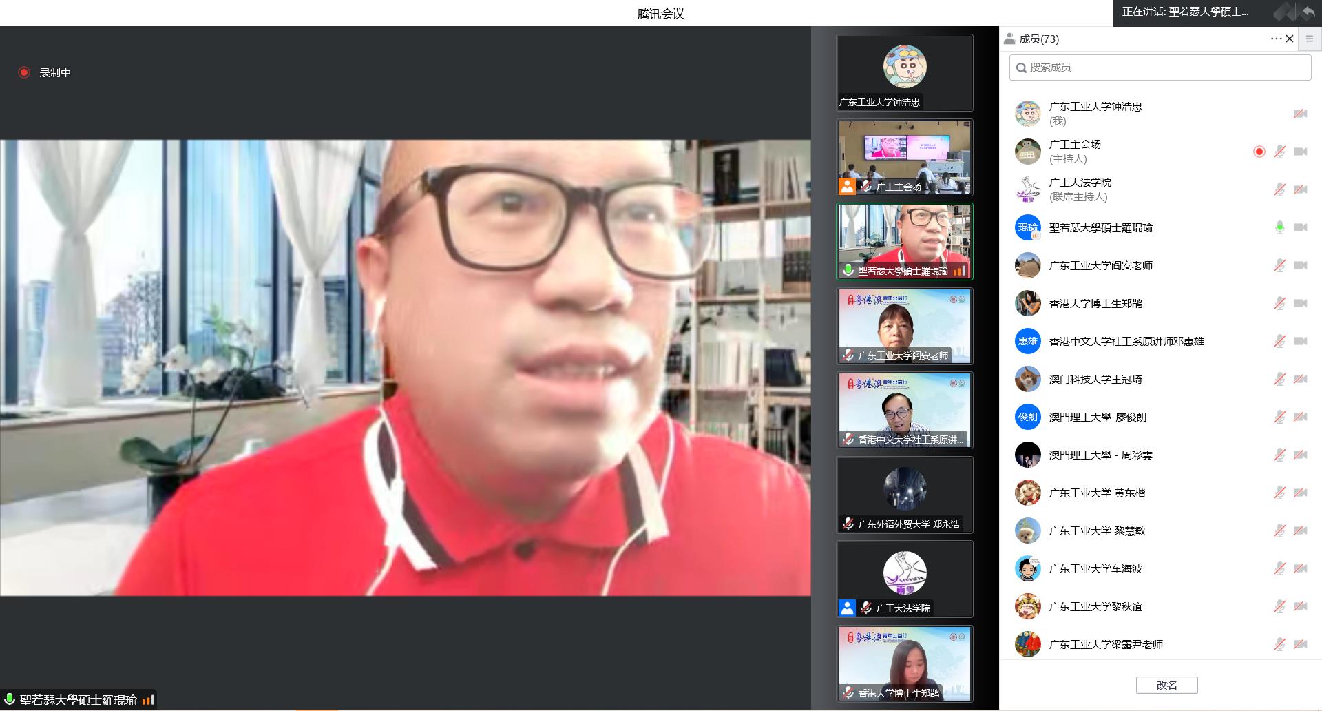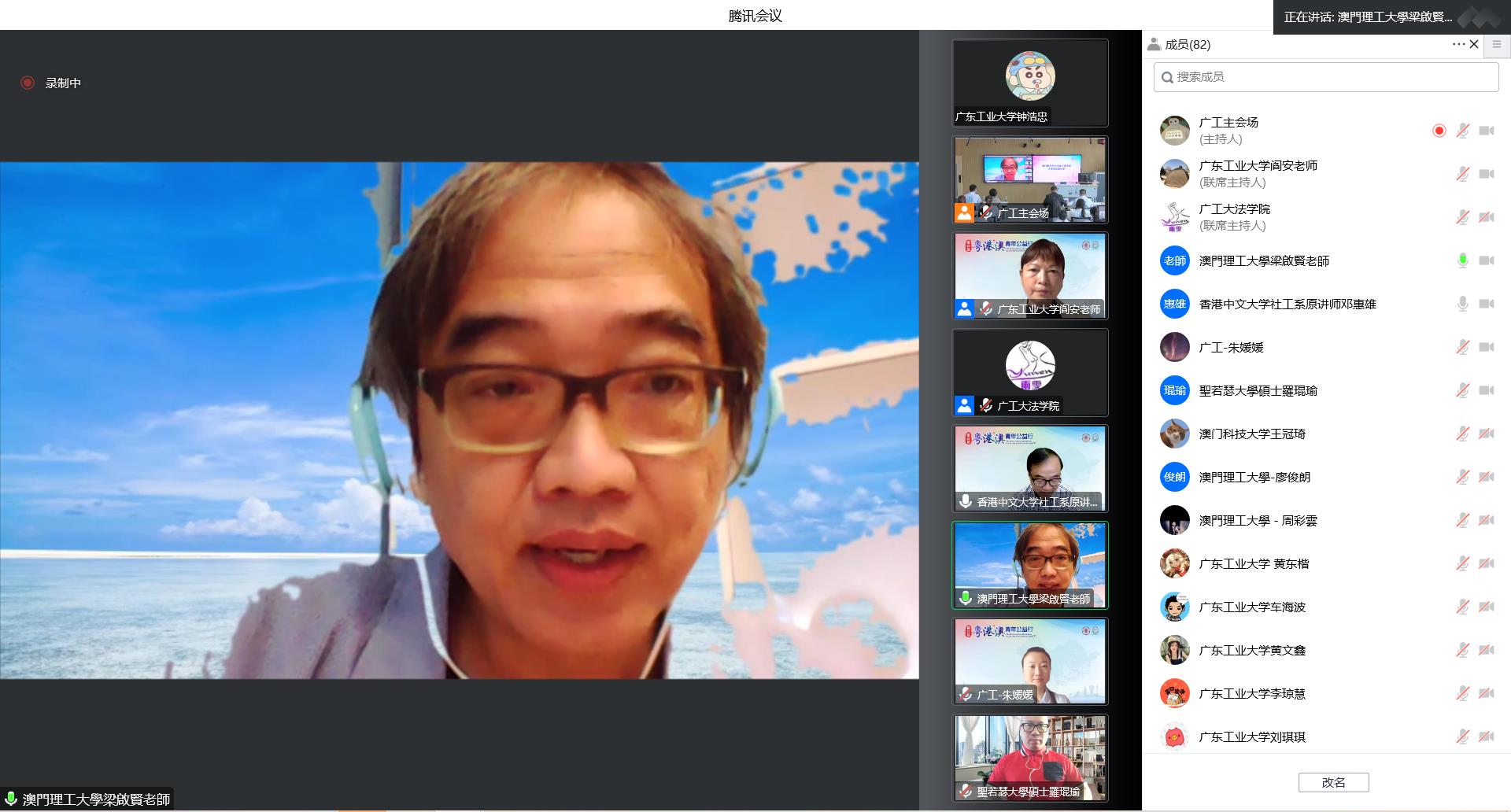 在三地社会工作发展情况交流环节,香港中文大学社会工作学系原讲师邓惠雄从香港社会福利服务概况、香港社会工作者业界组织概况、新冠疫情下社会工作面临的挑战与机遇等三方面介绍了香港社会工作发展情况;澳门理工大学社会工作学系讲师梁启贤以《澳门社会工作:官民合作的典范》为题,阐述了澳门社会服务、澳门社会工作局和澳门非政府组织的运行情况;环亚手机版登录入口法学院社会工作系副教授朱媛媛则介绍了该校社会工作专业课程设置及实习安排。