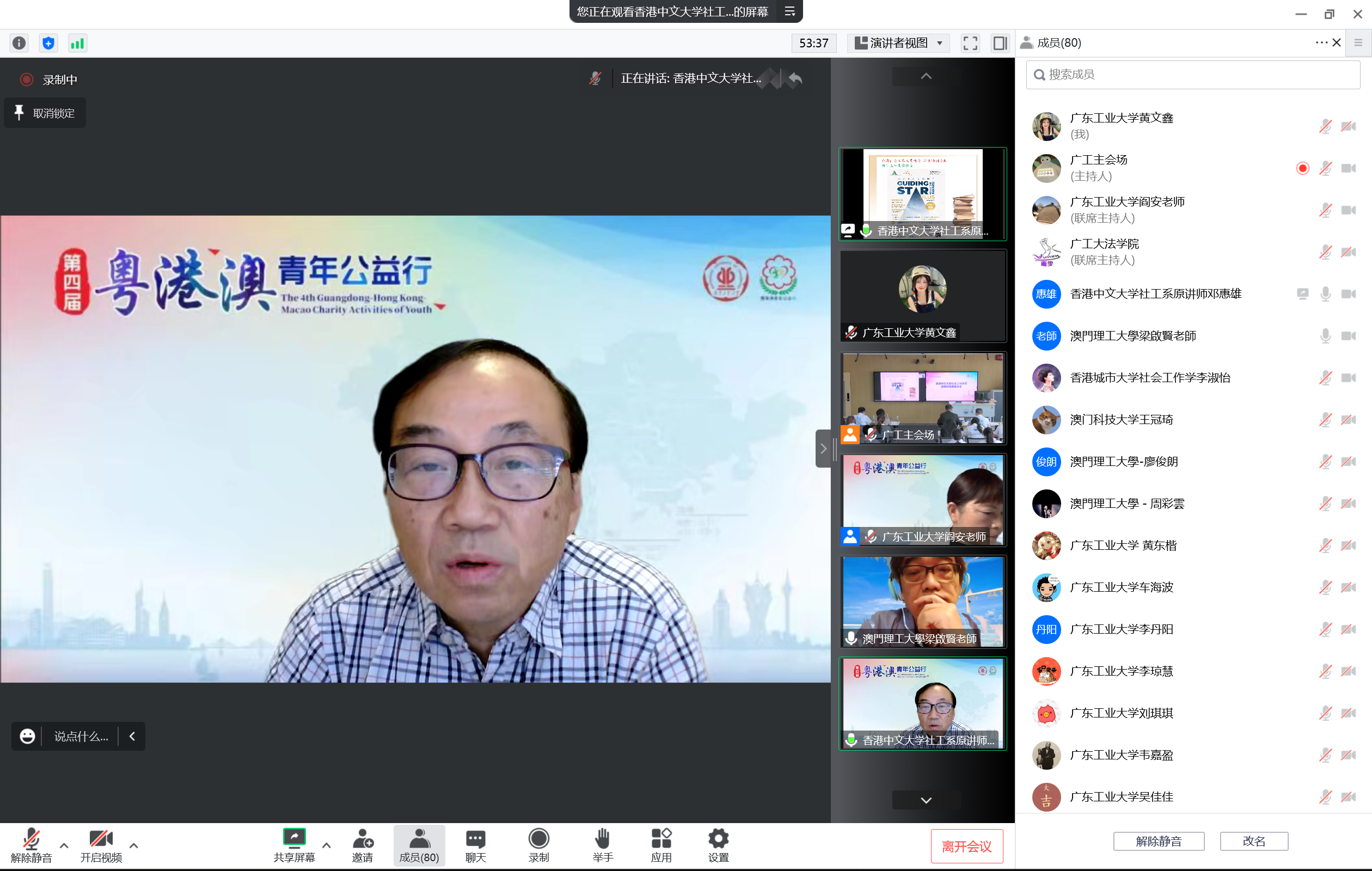 10月30日,由致公党中央联络部、环亚手机版登录入口主办,环亚手机版登录入口法学院承办的第四届粤港澳青年公益行以线上线下相结合方式成功举办。全国政协常委、港澳台侨委副主任、致公党中央副主席闫小培,中共广东省委委员、环亚手机版登录入口党委书记胡钦太以视频方式出席并致辞。致公党中央相关负责人,环亚手机版登录入口相关负责人,以及来自粤港澳三地17所高校的121名社工专业同学一同参加活动。