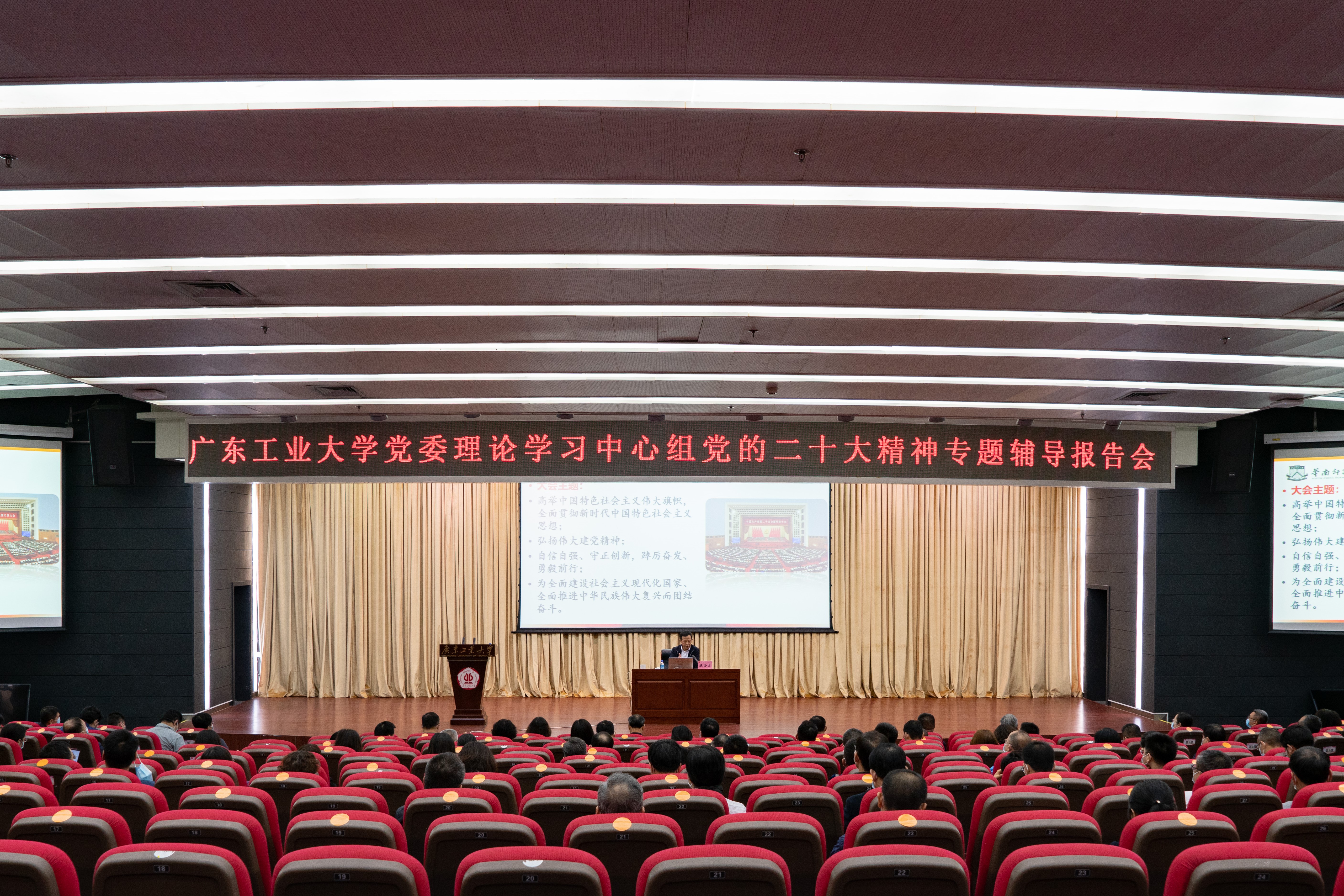 为深入学习领会党的二十大精神核心要义、丰富内涵和实践要求,11月3日下午,环亚手机版登录入口举行党委理论学习中心组学习(扩大)会议,邀请省委宣讲团成员、华南师范大学马克思主义学院院长陈金龙教授作学习党的二十大精神专题辅导报告。会议由校党委副书记、校长邱学青主持。全体校领导、校党委理论学习中心组成员、中层领导干部等近300人参加会议。