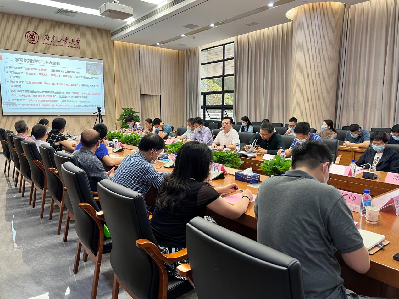 栾天罡在讲话中指出,党的二十大报告关于教育、科技、人才的重要论述,极大鼓舞了我们永远跟党走、奋进新征程的“精气神”,为我校开展人才工作指明了前进方向、提供了根本遵循。栾天罡就做好人才工作提出三点要求,一要坚持党管人才的原则,切实将思想和实际行动统一到党的二十大精神上来,贯彻落实习近平总书记、党中央关于实施新时代人才强国战略的决策部署,在新起点上奋力开创广工人才强校建设新局面。二要坚持“人才是第一资源”理念,凝聚人才合力,把各方面优秀人才集聚到党和人民事业中来,建设规模宏大、结构合理、素质优良的人才队伍,把人才与发展、与产业密切衔接,进一步优化各领域人才工作布局,培养造就更多一流科技领军人才、创新团队和青年科技人才。三要坚持“聚天下英才而用之”,为高质量发展夯实人才“压舱石”,引育并举,海纳英才、精准育才、高效育才,助力粤港澳大湾区建设世界重要人才中心和创新高地。
