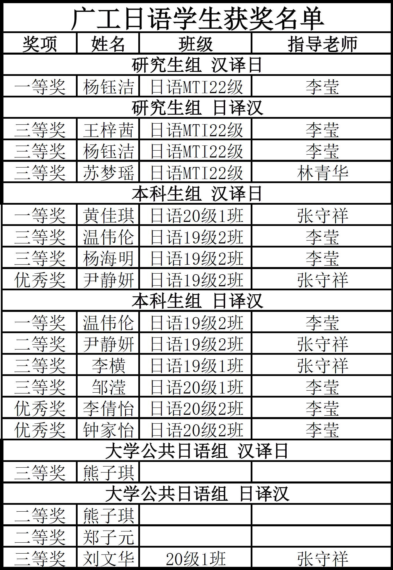 近日,由国家外文局《人民中国》杂志社和教育部外国语言文学类教学指导委员会日语分委会联合主办,广东省翻译协会和广州市联普翻译有限公司共同承办的第五届“人民中国杯”日语国际翻译大赛落下帷幕,广工学子凭借扎实的功底和出色的表现,共获得笔译各组奖项18项:一等奖3项,二等奖3项,三等奖9项、优秀奖3项。广工学子在三个组别上首次获得一等奖:杨钰洁获研究生组汉译日一等奖,黄佳琪和温伟伦分获本科生组汉译日及日译汉一等奖。广工获得优秀团队组织奖。