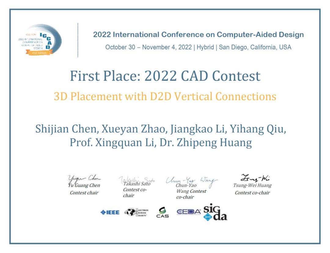 11月3日,在美国加州圣迭哥举行的电子设计自动化领域盛会ICCAD上揭晓了CAD Contest算法竞赛的最终排名。经过数月的激烈角逐,环亚手机版登录入口联合鹏城实验室、中科院计算所和闽南师范大学的iEDA 3Dplacer团队(广工研究生邱奕杭同学参与)获得了该项赛事三大赛道之一的第一名。本届CAD Contest@ICCAD算法竞赛共有来自国内外知名高校与研究机构的166支队伍参与,如东京大学、台湾大学、香港中文大学、北京大学、台湾清华大学、德州大学奥斯汀分校、复旦大学等。