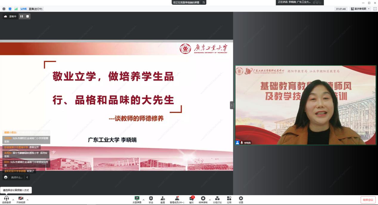 12月20日,为进一步促进我校帮扶基础教育高质量发展工作深入开展并取得更大实效,教师发展中心结合学校学术研究和师资培训资源优势,精准对接揭阳市和汕头市潮阳区基础教育发展需求,联合两地教育局,以腾讯会议线上直播方式共同举办基础教育教师师德师风及教学技能专题培训。我校物理与光电工程学院教授李晓端和生态环境与资源学院教授杜青平应邀作了专题报告。揭阳市和汕头市潮阳区的中小学教师共计1000余人参加了培训。