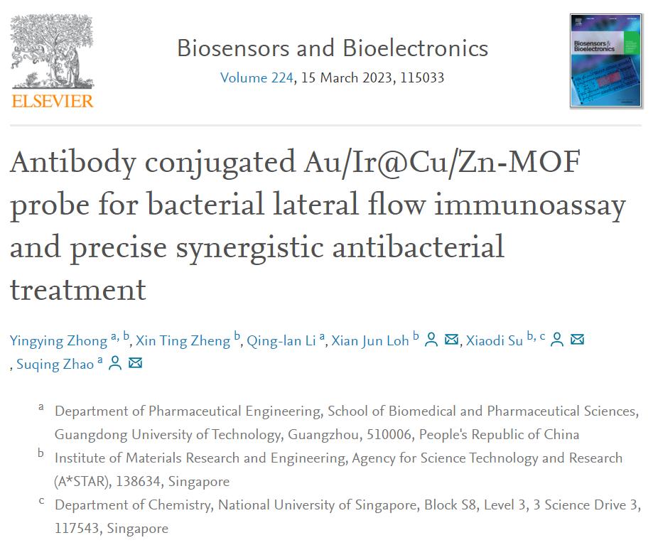 学校生物医药学院赵肃清教授团队最新研究成果“Antibody conjugated Au/Ir@Cu/Zn-MOF probe for bacterial lateral flow immunoassay and precise synergistic antibacterial treatment”被国际生物传感器领域顶级学术期刊Biosensors and Bioelectronics发表。该期刊为生化分析及传感器领域TOP期刊,2021-2022年度最新影响因子为12.545,CiteScore为20.20,在全球同类SCI学术期刊中长期排名第一。该论文环亚手机版登录入口为第一完成单位,赵肃清教授和Su Xiaodi为通讯作者,博士研究生钟颖颖为第一作者,论文DOI: 10.1016/j.bios.2022.115033。