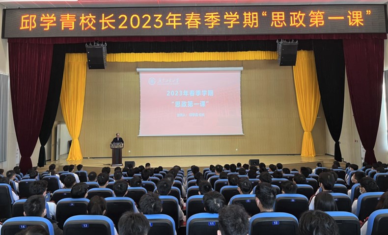 2月22日,学校党委副书记、校长邱学青来到揭阳校区,以“在实现民族复兴的赛道上奋勇争先”为主题,为同学们讲授2023年春季学期“思政第一课”。他以学习贯彻党的二十大精神为指引,把“青年的命运当与时代同频共振”作为主线,介绍不同历史时期青年人的奋斗事迹,用身边的广工故事勉励青年学子要牢记时代使命,敢于作为,善于思考,保持奋勇争先的姿态,找准人生航向,传承广工精神,做新时代的攀登者、奋斗者,为实现中华民族伟大复兴的中国梦不懈奋斗。