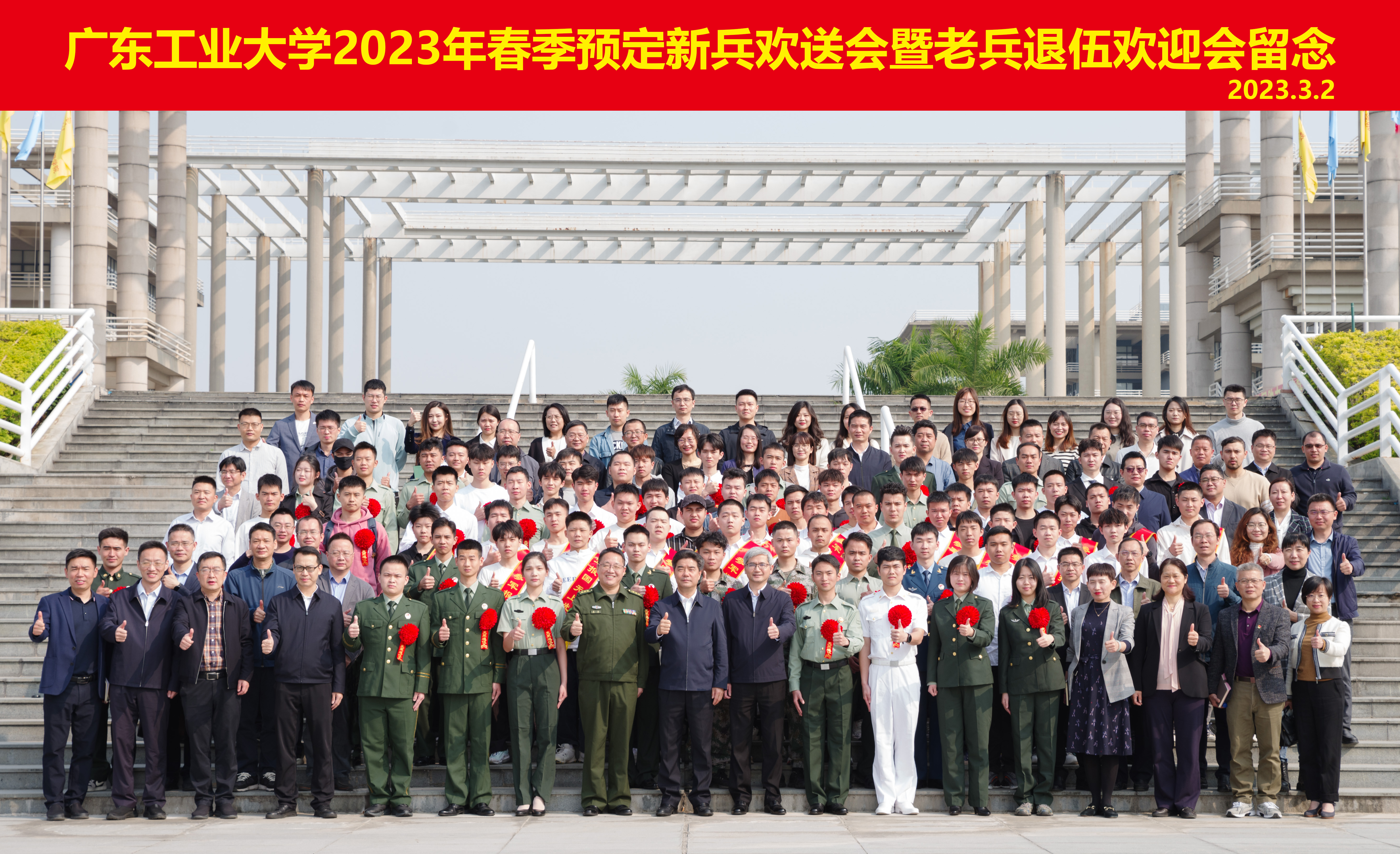 3月2日上午,学校在大学城校区举行“携笔从戎保家卫国,建功立业不负韶华”2023年春季预定新兵欢送会暨老兵退伍欢迎会,进一步安排部署2023年征兵工作。学校党委书记胡钦太,学校党委常委、副校长陈卓武,越秀区委常委、区人民武装部部长郑磊,各学院党组织书记及相关工作人员,2023年春季预定新兵和在校退伍老兵等近200人参加会议。