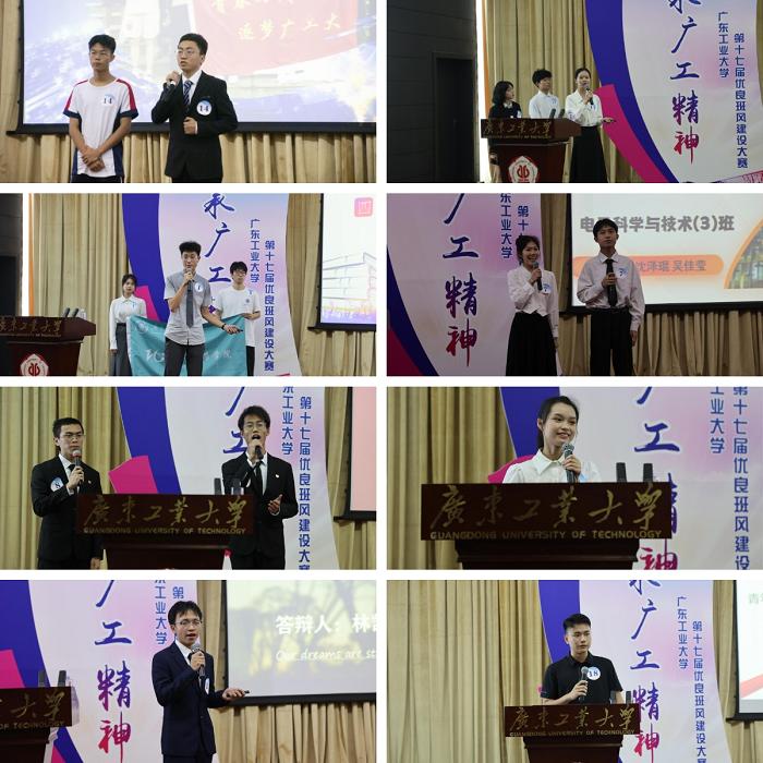 决赛现场,来自21个学院的2022级优秀班级代表结合PPT介绍了班级基本情况、班级建设特色做法以及班级未来发展规划等,深入交流展示了各班级在思想引领、学业帮扶、课外实践、团队建设、班团干部培养等方面积累的有益经验与取得的建设成效。自动化学院参赛班级树立特色“家规”“家风”,突出班团一体化建设成果;法学院参赛班级围绕“四友之力”体现班级宿舍管理、心理健康、文体活动工作成效;艺术与设计学院参赛班级利用短视频及现场书法作品展示宣传学院学科特色;先进制造学院参赛班级结合揭阳校区特色,充分发挥专业特色优势,深入挖掘美育、劳动教育、社会实践元素等。在答辩环节,教师评委围绕班团建设、学风建设、爱校荣校教育、安全教育、劳动教育、网络文明教育及班级相关制度创建执行等向各班级代表提问,共同探讨关于创建优良班风校风的思考。