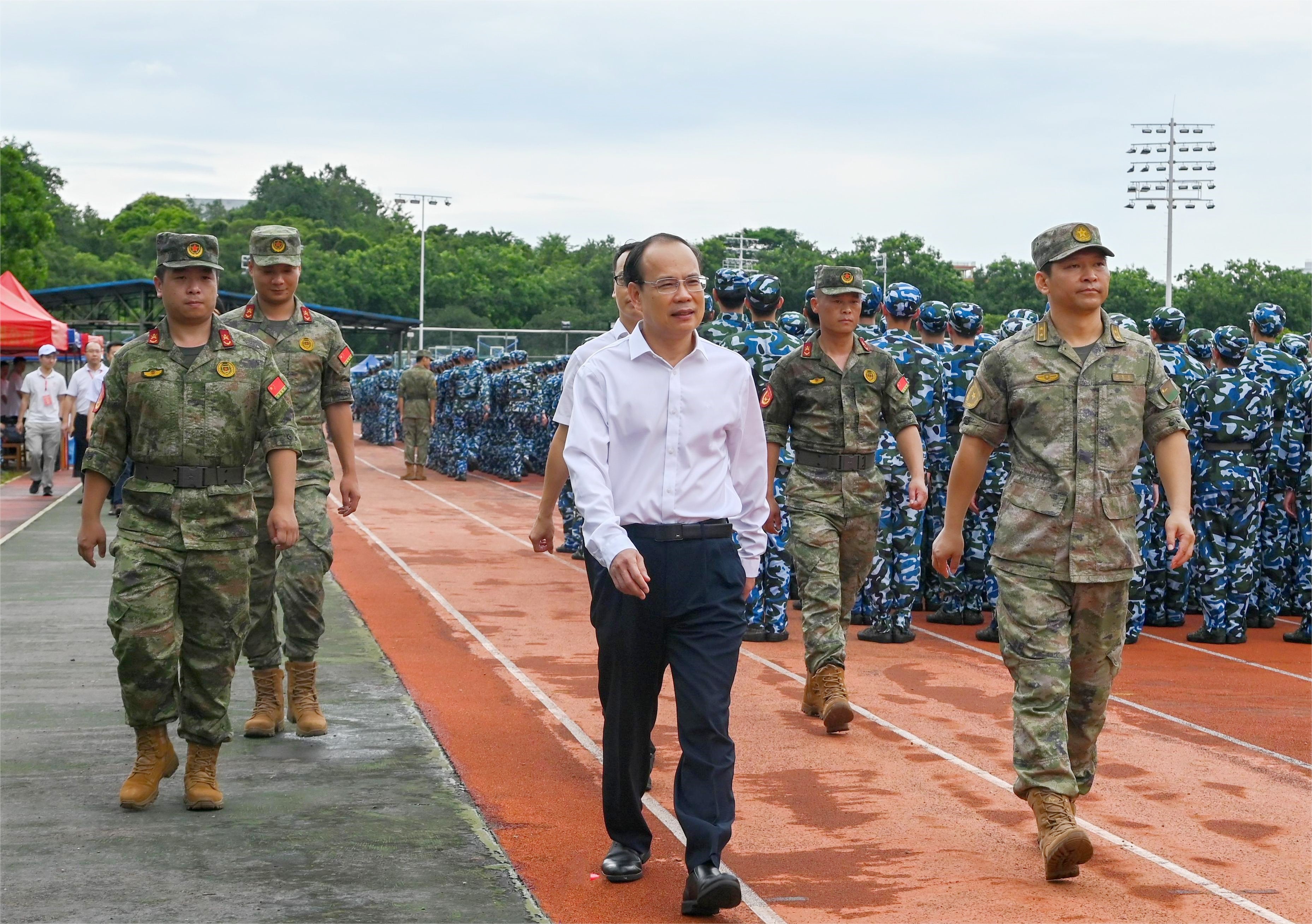 陈卓武在训练场检查指导军训后勤保障服务工作,详细了解医疗、饭堂就餐、凉茶供应、饮用水供应等保障工作,对学校武装部、总务部、保卫处、团委、医院等部门为军训提供的坚实保障表示肯定,并对学生消防演练现场工作进行指导