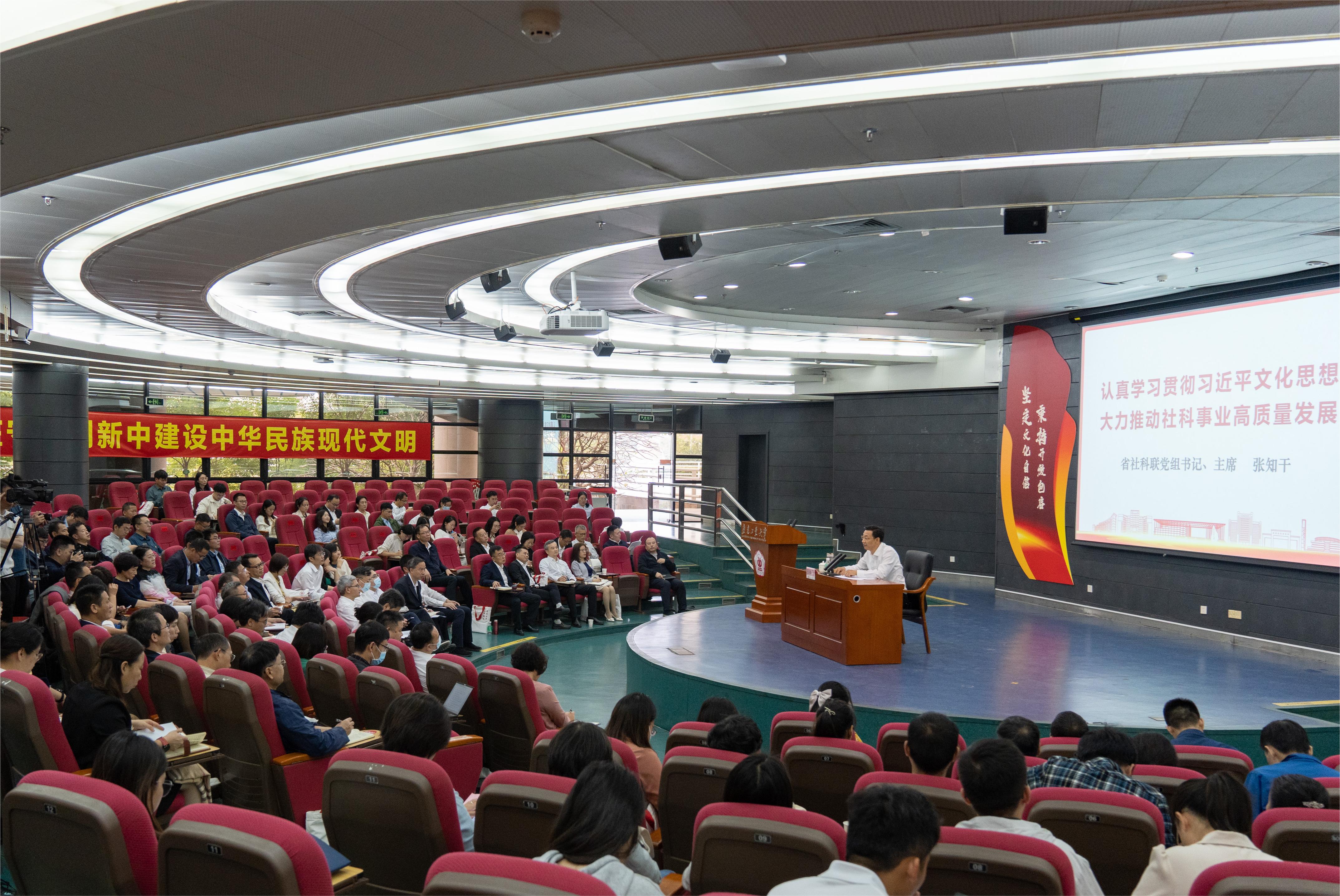 张知干以《认真学习贯彻习近平文化思想 大力推动社科事业高质量发展》为题,深入系统阐述了习近平文化思想的精髓要义和重大意义。他指出,学习领会全国宣传思想文化工作会议的主要精神,要深刻理解会议名称的新变化,认真学习领会好习近平总书记的重要指示,深刻领会和把握宣传思想文化工作会议取得的最重要的政治成果。他强调,贯彻好宣传思想文化工作会议精神,重点要在加强对习近平新时代中国特色社会主义思想的宣传研究阐释上有新作为;在培育和践行社会主义核心价值观上有新作为;在挖掘弘扬中华优秀传统文化上有新作为;在服务中国式现代化建设大局提供智慧上有新作为;在增强中华文明传播力影响力上有新作为;在加强党对社科工作的全面领导上有新作为。