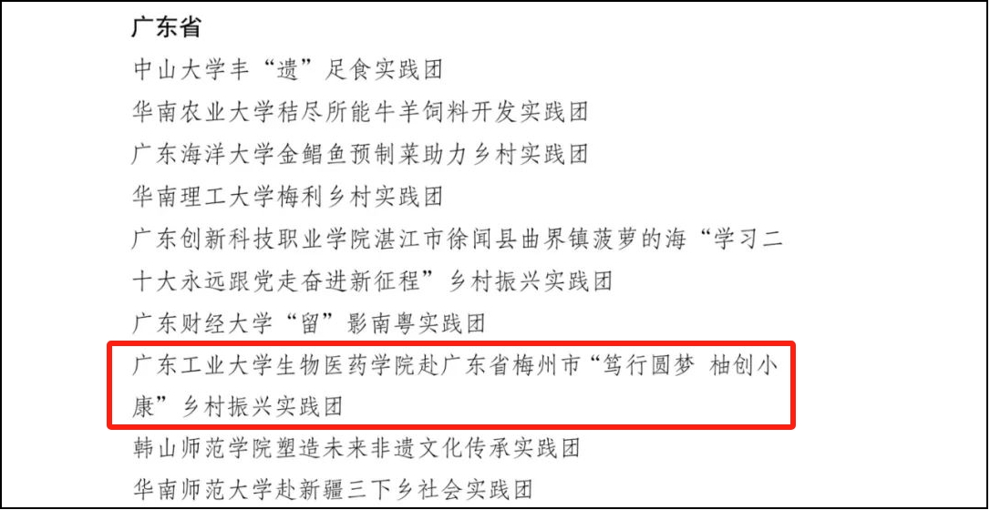 日前,共青团中央通报了2023年全国大中专学生志愿者暑期文化科技卫生“三下乡”社会实践活动总结情况,在本次社会实践活动中,广工生物医药学院“笃行圆梦,柚创小康”乡村振兴实践团入选2023年“三下乡”社会实践全国优秀团队。