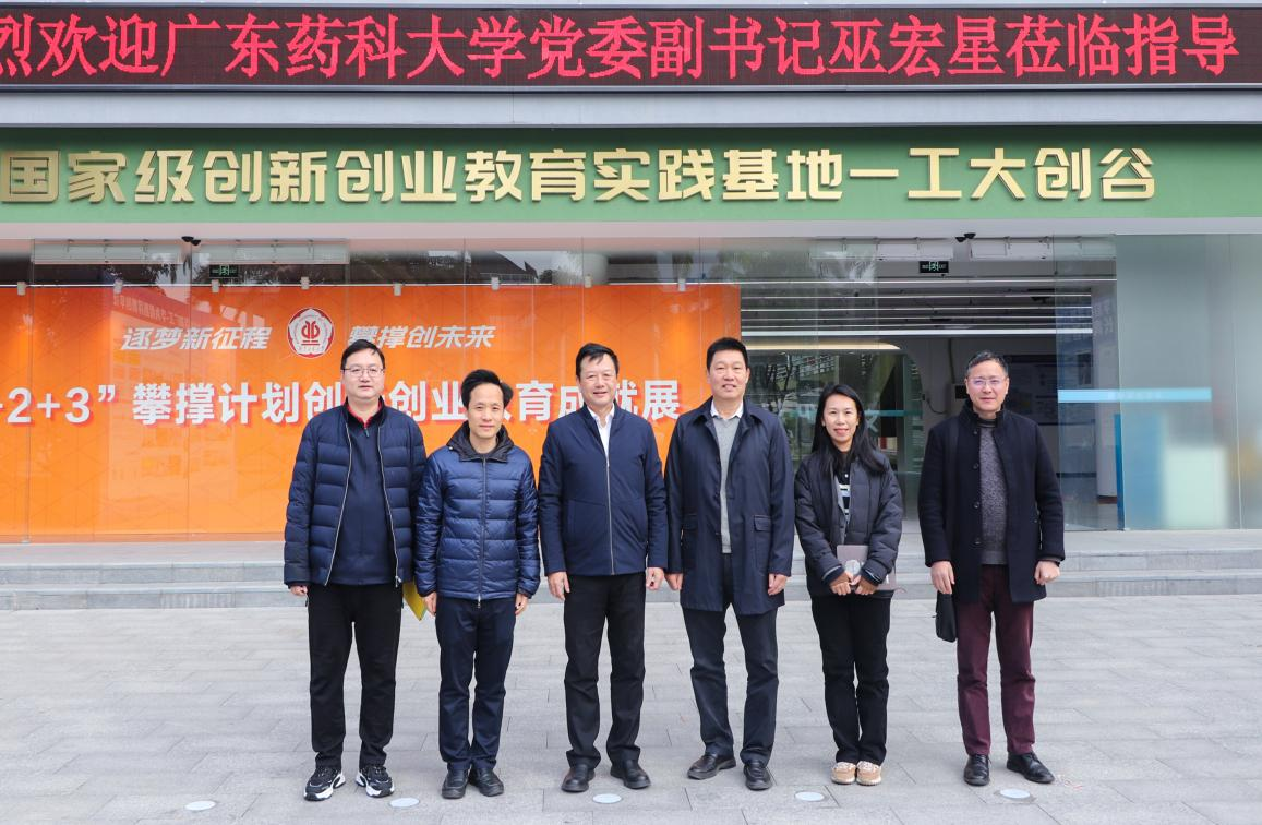 12月22日下午,广东药科大学党委副书记巫宏星一行5人来校访问,调研创新创业教育工作,学校党委常委、副校级干部张学理在国家级创新创业教育实践基地——工大创谷会见巫宏星一行。