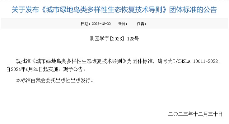 由学校牵头编制的《城市绿地鸟类多样性生态恢复技术导则》团体标准正式发布