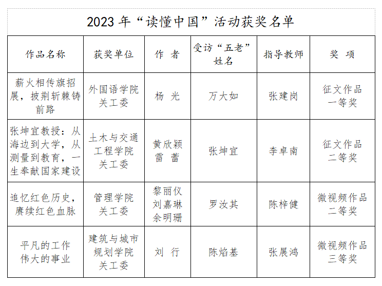 近日,广东省教育系统关心下一代工作委员会发布《关于公布2023年开展“读懂中国”活动作品评审结果的通报》(粤教关工委[2023]10号),广工获为2023年“读懂中国”活动优秀组织奖,参赛作品获征文作品一等奖1项、二等奖1项,微视频作品二等奖1项、三等奖1项(详见下表)。