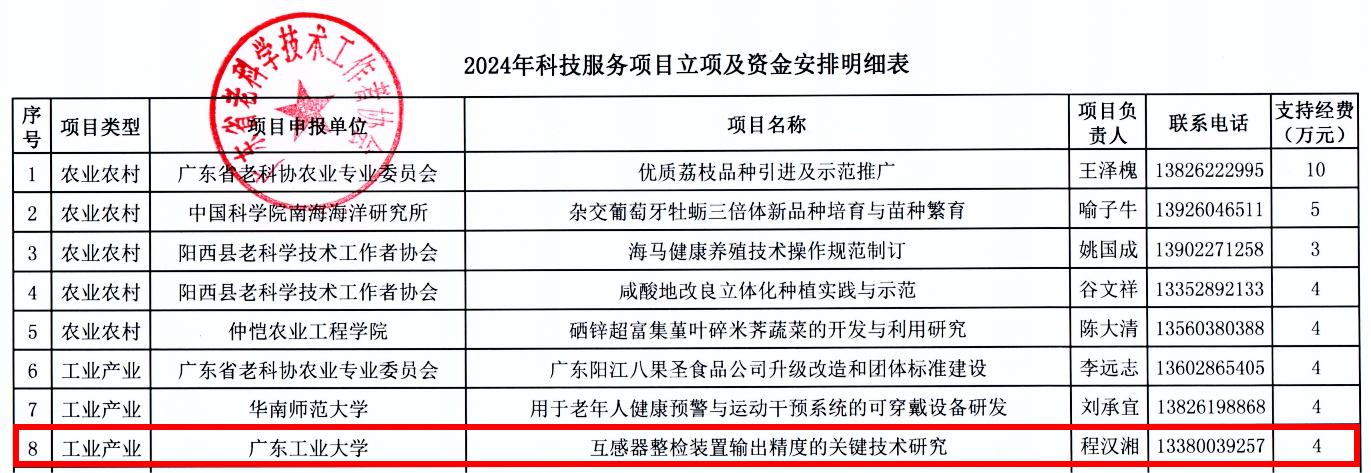 近日,广东省老科学技术工作者协会发布了《关于公布2024年科技服务专项的通知》(粤老科协[2024]13号),广工退休教授程汉湘教授主持的项目《互感器整检装置输出精度的关键技术研究》成功获得立项,并获得4万元支持经费。