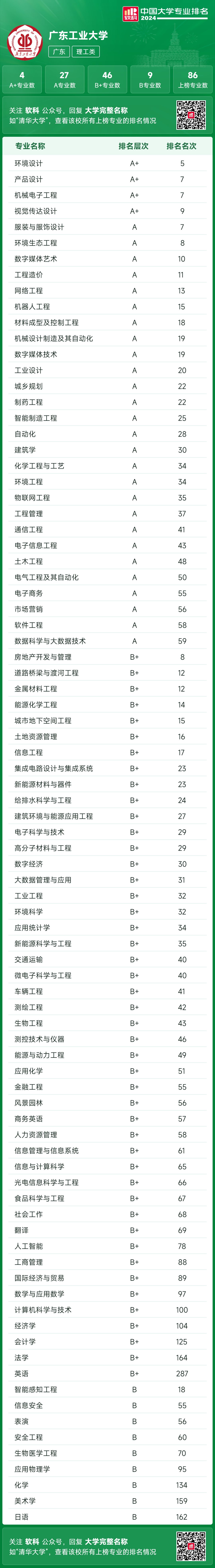 近日,高等教育评价专业机构软科发布2024软科中国大学专业排名,广工上榜86个专业,较去年增加5个,上榜专业占比达98.9%,其中,4个A+专业、27个A专业、46个B+专业、9个B专业,A+类分别为环境设计、机械电子工程、产品设计以及视觉传达设计。