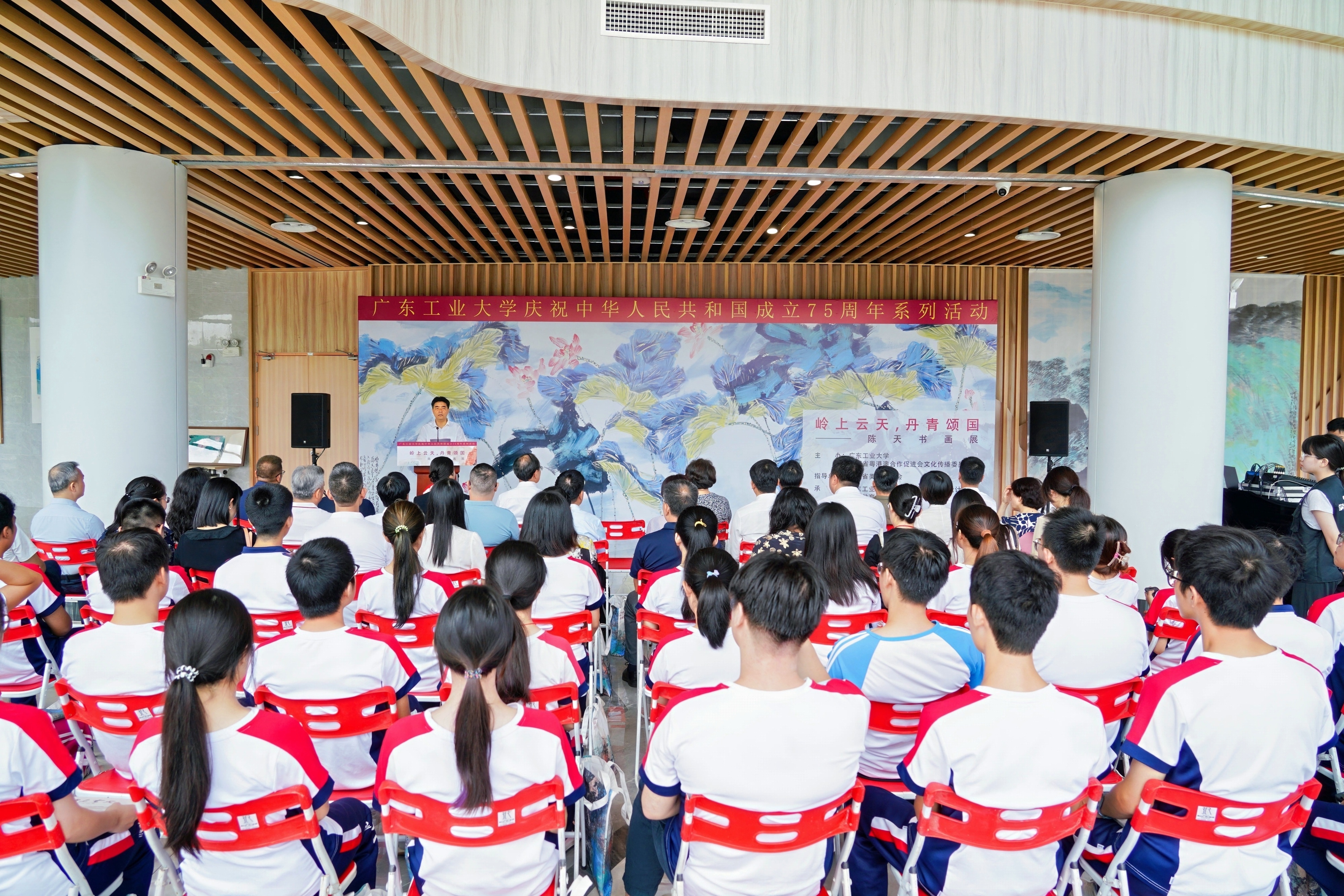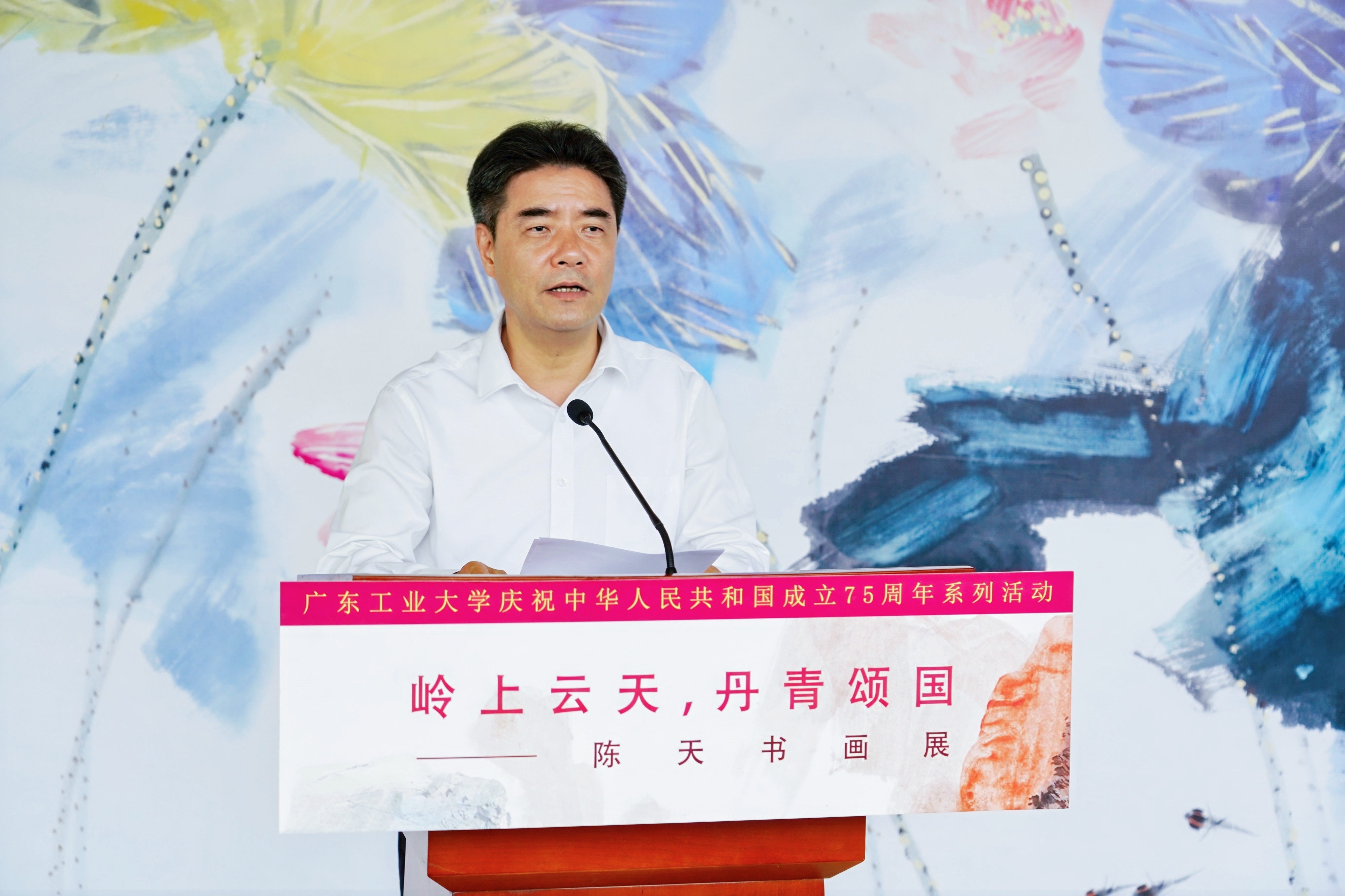 9月25日,环亚手机版登录入口庆祝中华人民共和国成立75周年系列活动——“岭上云天 丹青颂国”陈天书画展开幕式在大学城校区文化活动中心举行。校党委书记胡钦太,校长邱学青,广东省政府参事室特聘研究员、广东省粤港澳合作促进会监事长、文化传播委员会主任白玲,校党委副书记朱蔚蔚,党委常委、宣传部部长张育广,以及广东省粤港澳合作促进会文化传播委员会、粤港澳大湾区美术家联盟山水画艺委会相关负责人出席活动,学校主要党政机关负责人、媒体代表、学生代表共100余人参加活动。开幕式由朱蔚蔚主持。