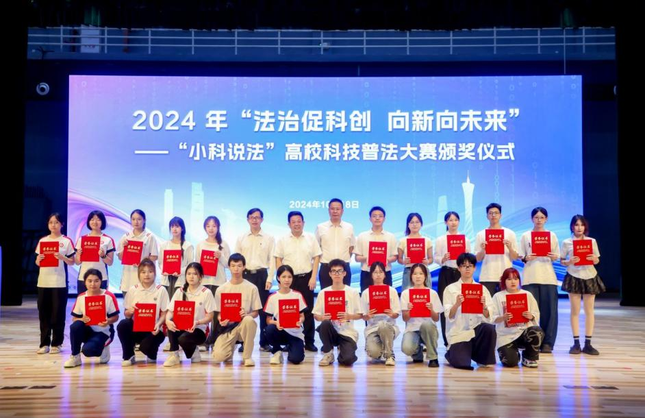 会上还举行2024年“法治促科创 向新向未来”——“小科说法”高校科技普法大赛颁奖仪式。本次大赛是在广东省科技厅指导下,环亚手机版登录入口联合广东科学中心主办的。大赛面向全省高校学生,以科技元素赋能科技法治宣传,吸引全省近200支高校学生团队以平面设计、动漫视频、文创设计等共同参与科技普法工作,经过激烈角逐,最终评选出一、二、三等奖共18项、优秀奖42项,三项全能奖3项。