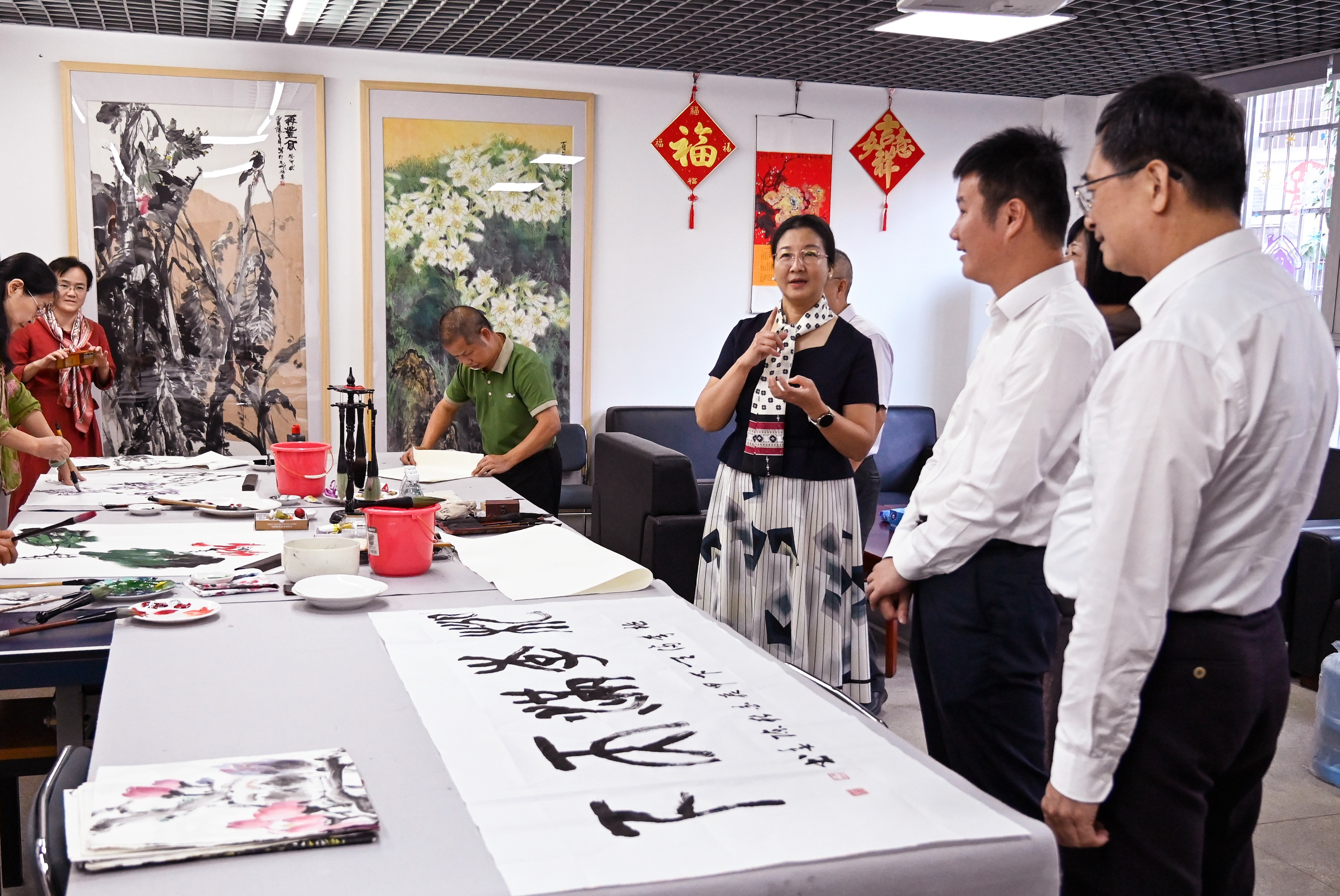 开幕式上,离退休工作处主要负责人介绍了展览的主题和意义,他表示,这次书画摄影作品展不仅是一次艺术的交流,更是老同志们对党和国家的深情献礼,展现了他们对祖国的热爱和对美好生活的向往。随后,与会嘉宾共同为“广工•景芸颐养文创工作室”揭牌,工作室的成立将为离退休老同志提供一个展示和交流的平台,进一步丰富他们的精神文化生活。