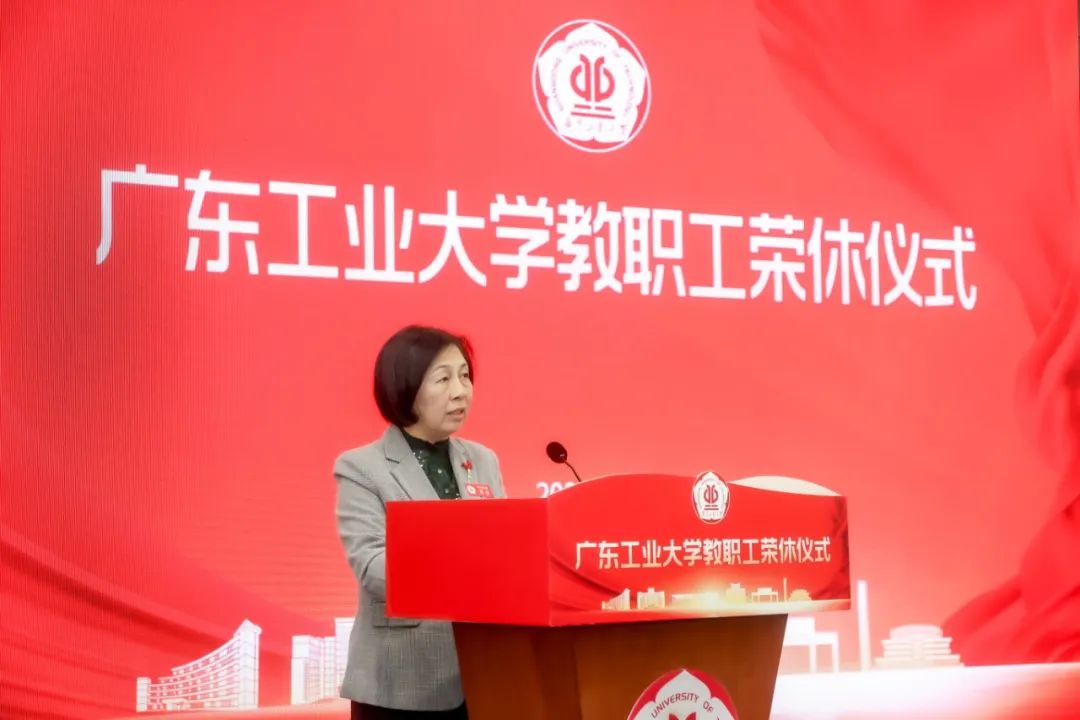 荣休教职工代表、管理学院邓彦深情回顾了与广工同行四十一载的点点滴滴,历经学生、教师的多重角色转换,见证了学校的每一步稳健发展直至飞跃,表示将继续支持学校的每一步成长与辉煌。