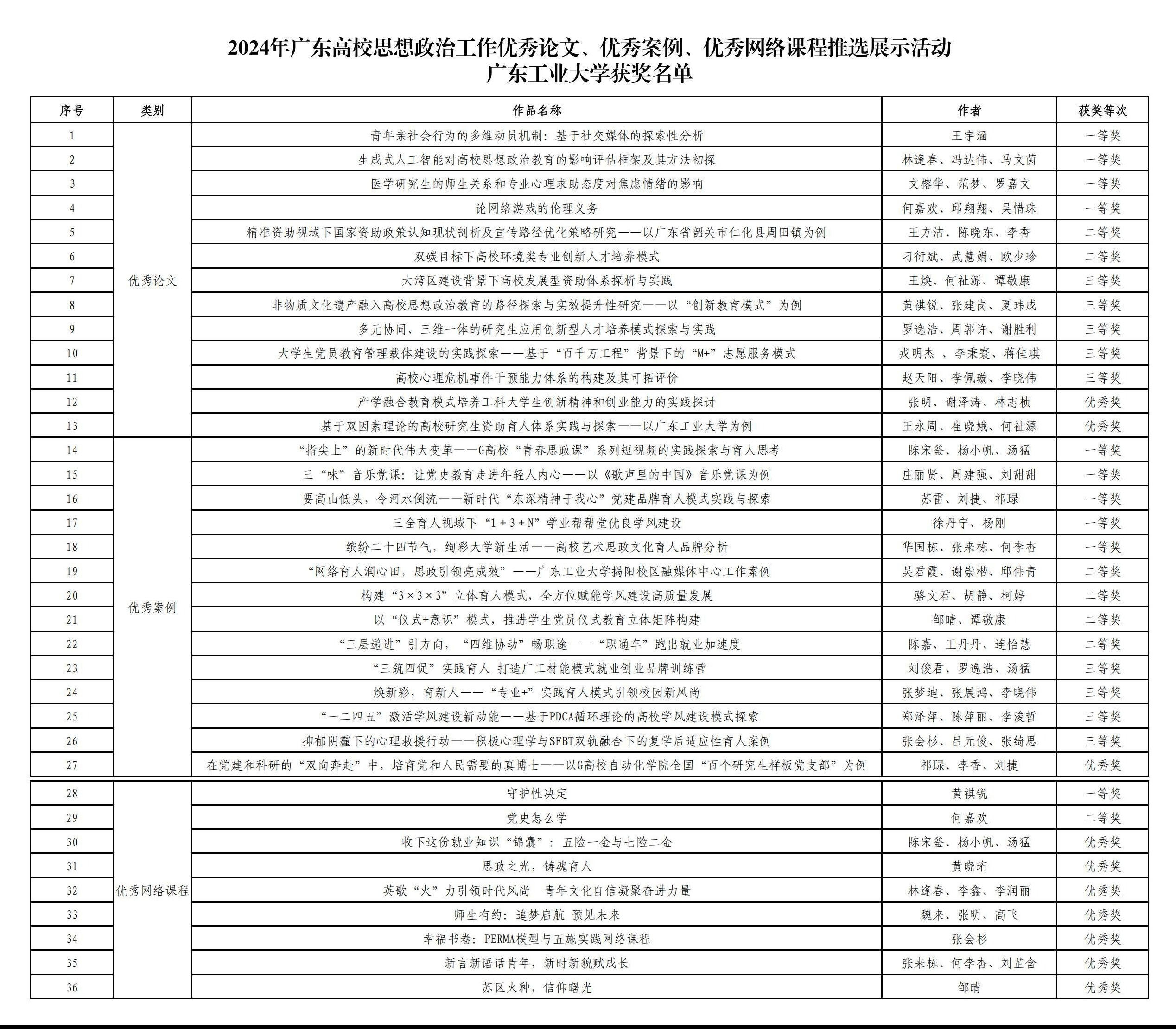 近日,由高校思想政治工作队伍培训研修中心(华南师范大学)组织开展的,2024年广东高校思想政治工作优秀论文、优秀案例、优秀网络课程推选展示活动评选结果公布。广工共有36项作品获奖,其中一等奖10项、二等奖7项、三等奖9项、优秀奖10项,获奖情况全省高校中名列前茅。