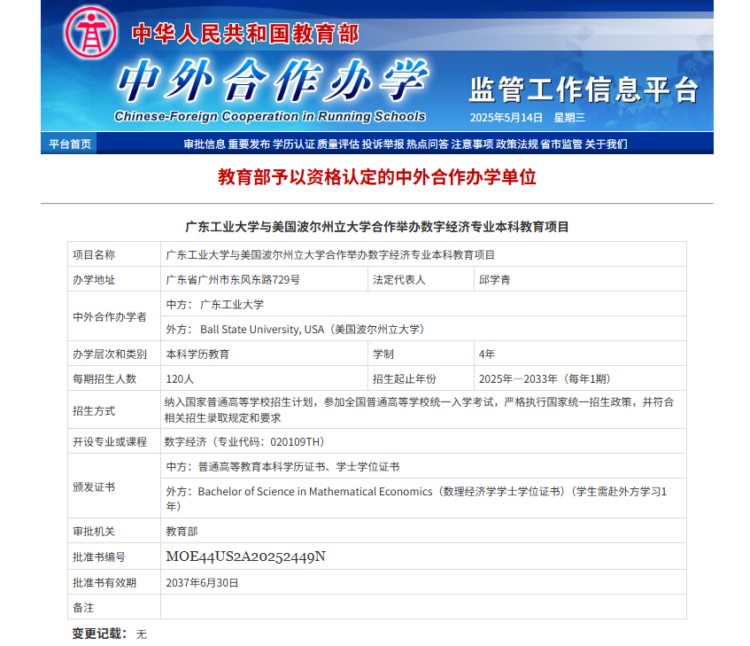 据悉,此次教育部共批准68个本科以上中外(含内地与港澳台)合作办学项目,广东省仅2所高校项目获批。本项目的成功获批将为广工特色优势学科注入新活力,助力完善学科布局,推动学校朝着“特色鲜明、国内一流、世界知名”高水平创新型大学目标大步迈进。项目贯通“引进、消化、融合、创新”全链条,实现数字经济国际优质教育资源本土化,协同计算机、控制、数学等交叉学科共同发展,拓宽国际化办学视野,为大湾区发展提供关键的数字经济人才与智力支持,在全国高校中外合作办学中发挥积极示范作用。