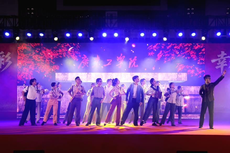 本场演出亮点纷呈,幸福艺术团与广工校内各大艺术团轮番登台,传承红色基因,呈现校园活力,演绎了一场时代主题与青春脉搏的共振。演出在幸福艺术团活力四射的舞蹈《战鼓催征》中正式开启,铿锵鼓点震彻全场,刚劲舞姿尽显豪迈,将水兵的坚毅风骨与奋进姿态演绎得淋漓尽致。广工戏剧团带来的音乐剧《出发》、舞蹈团演绎的《水润紫荆》,生动复刻了上世纪60年代广东工学院200余名师生奔赴东深供水工程前线的热血场景,将前辈们用汗水与生命铸就的工匠精神、坚守精神融入艺术表达。幸福艺术团则以男女声独唱、男声四重唱、手风琴齐奏等形式的节目传递赤诚情怀,女声独唱《五星红旗》将对祖国的赤诚热爱娓娓道来,《英雄赞歌》重现革命年代的壮志豪情,武术散打《强拳出击》展现力量之美,经典歌舞《南泥湾》重现奋斗荣光。国家一级演员孙洪涛带来的朗诵《永远的吉鸿昌》,更让现场师生深受震撼。