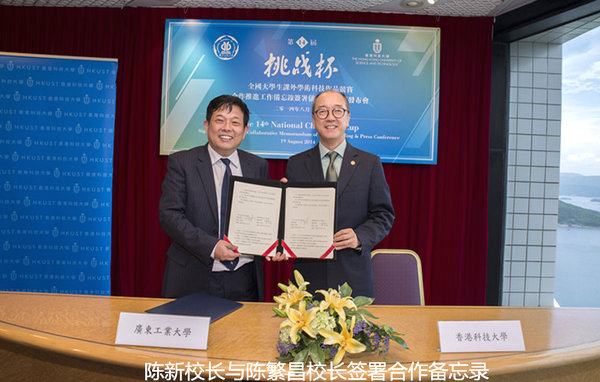 本网讯8月19日上午,团省委书记曾颖如、副书记池志雄,校长陈新、副校级干部张学理等一行前往香港,与香港科技大学就第十四届“挑战杯”全国大学生课外学术科技作品竞赛未来一年的筹备工作、赛后延伸活动等主题进行磋商。陈新与香港科技大学校长陈繁昌就“挑战杯”竞赛合作推进工作签署了备忘录,就双方如何推进竞赛订定合作细则。香港科技大学首席副校长史维,副校长翁以登、李行伟、谭嘉因,校长特别助理倪明选等出席了座谈会和备忘录签署仪式。