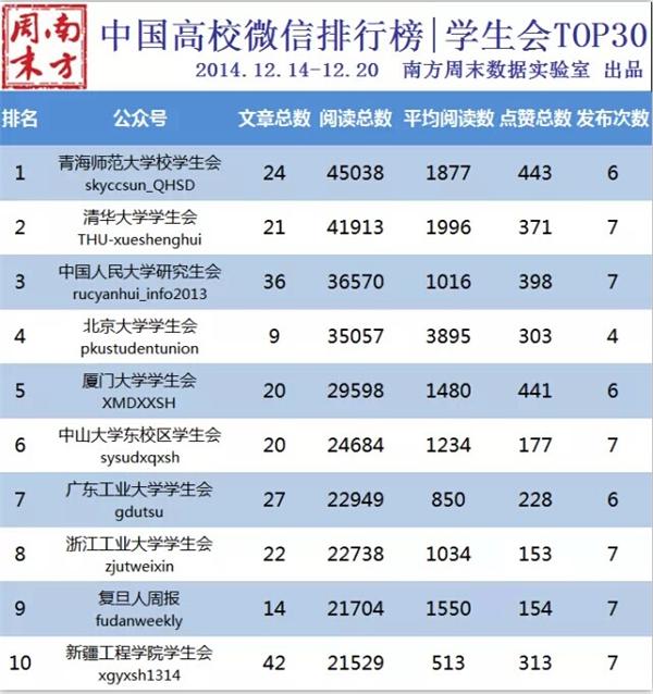 本网讯 12月22日,南方周末数据实验室发布12月14~20日中国高校微信排行榜。环亚手机版登录入口官方微信、学生会官方微信、社联官方微信都进入全国TOP30。