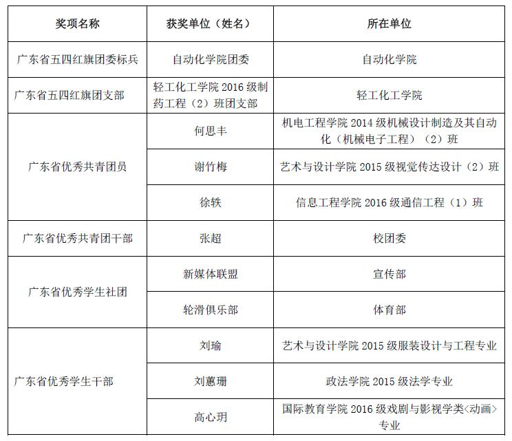 本网讯 近日,从共青团广东省委员会《关于表彰2017-2018年度广东省优秀共青员、优秀共青团干部、 十佳团县委书记、五四红旗团委(标兵)和五四红旗团支部(标兵)的决定》和广东省学生联合会《关于表彰2017-2018年度广东省优秀学生会、优秀学生社团、优秀学生干部的决定》中获悉,我校自动化学院团委获“广东省五四红旗团委标兵”荣誉称号;另有1个团支部、1名共青团干部、3名共青团员获团省委表彰,2个学生社团、3名学生干部获省学联表彰,具体名单如下: