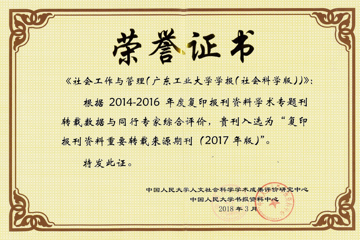 本网讯 近日,《社会工作与管理》(原《环亚手机版登录入口学报:社会科学版》)入选中国人民大学人文社会科学学术成果评价中心和中国人民大学书报资料中心联合研制的“复印报刊资料重要转载来源期刊(2017年版)”。该遴选每三年进行一次,是国内重要的学术期刊评价体系之一。在2017年度复印报刊资料转载指数排名中,《社会工作与管理》全文转载率达到9.52%,在全国195种社会学学科期刊中位列第11名,综合指数位列第14名,进入社会学期刊十五强。在全国1150种高校主办的学报中,《社会工作与管理》全文转载率位列第83名,综合指数位列第88名,跻身高校学报百强。