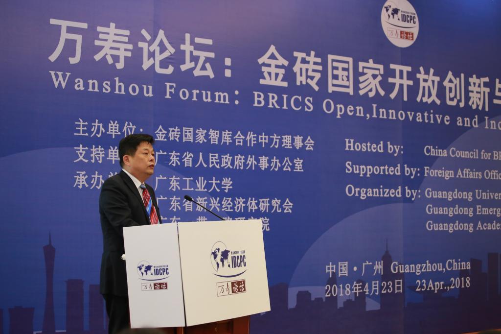 栾建章主任在致辞中还介绍,“万寿论坛”是中联部于2016年发起主办的国际交流与对话平台,旨在邀请中外政党政要、智库学者、民间社会组织代表围绕构建人类命运共同体和建设美好世界、新型南南合作、政党政治、治国治党经验、国际地区热点问题、社会政治思潮等主题进行坦诚对话和观点碰撞,促进各方思想交流和战略沟通,以更好地推动中国与世界的相互了解和互学互鉴。创立两年多来,“万寿论坛”始终致力于讲好中国故事、增进中外理解、推动智识分享,得到了外国政党政要和国内外专家学者的广泛认同。金砖国家智库合作中方理事会以“万寿论坛”名义举办研讨会,就是想让中方理事会这一工作平台和万寿论坛这一交流平台发生密切联系,更充分地呈现中方理事会的思想智慧,更有效地放大思想交流的品牌效应,从而进一步提高活动的参与面、激发思想的活跃度、扩大交流的影响力。本次研讨会以“万寿论坛”名义进行,也是基于这方面的考虑。这是“万寿论坛”第一次在广州举办,也是今年举办的金砖国家智库国际研讨会系列活动的第一场。