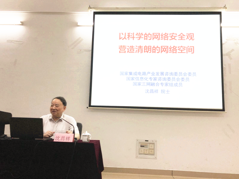 本网讯 6月7日上午,中国工程院院士沈昌祥教授应邀来到我校计算机学院,作题为“以科学的网络安全观,营造清朗的网络空间”的学术报告。学校党委常委、副校长陈为民会见了沈昌祥院士,双方就我国网络空间安全(信息安全)学科发展现状及学校的发展特色等进行了交流。计算机学院院长负责人,我校师生约一百多人参加了院士学术报告会。