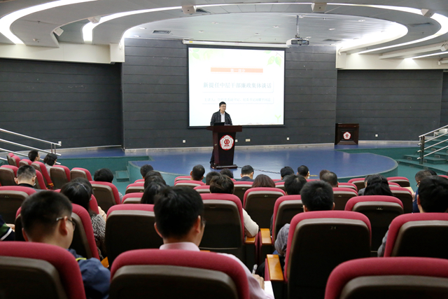本网讯 2月28日下午,我校2018年换届新提任中层干部任前集体谈话与廉政谈话会在大讲堂圆弧报告厅召开。学校党委副书记、纪委书记汤耀平和党委副书记陈良友分别围绕干部党风廉政建设和干部队伍建设内容对与会全体干部进行了集体谈话,新提任中层干部80余人参加会议。