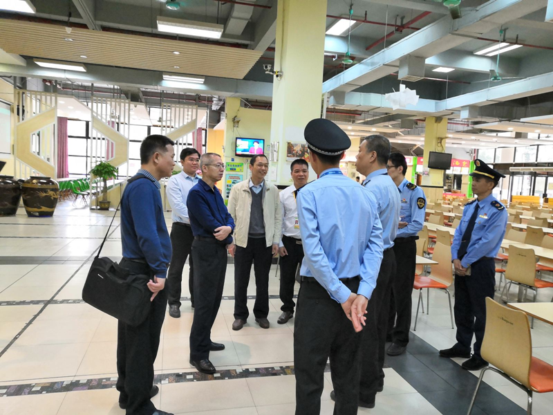 陈立中先后重点检查了大学城校区院士团队建设项目、垃圾分类、南亭西街河涌治理,龙洞校区水上餐厅改造、新招标内区一楼食堂开餐准备,东风路校区七号楼外墙安全隐患排查等情况。期间,与番禺区食品药品监督管理局副局长孙福荣一行共同检查了大学城校区东一食堂,听取了食堂负责人的工作汇报,孙福荣一行对我校领导的重视以及我校食堂卫生安全保障工作给予了充分肯定。