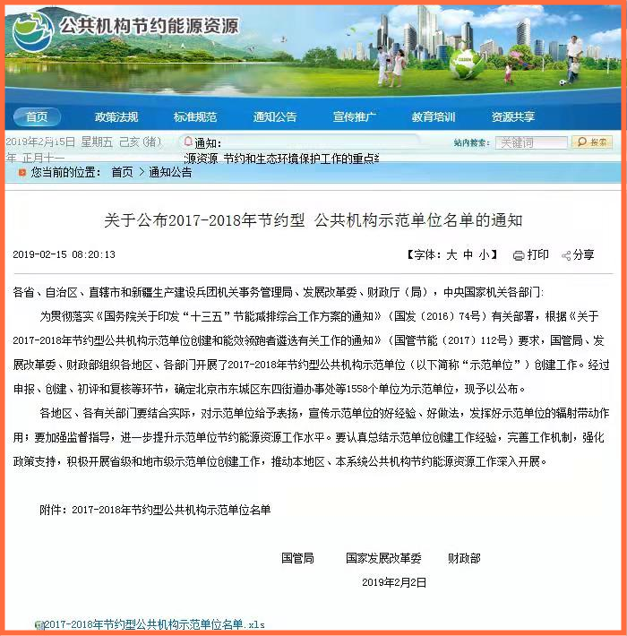 本网讯 近日,国家机关事务管理局、国家发展改革委与财政部联合发布《关于公布2017-2018年节约型公共机构示范单位名单的通知》(国管节能〔2019〕35号)(http://ecpi.ggj.gov.cn/news/61359?kind_id=4&flag=video_news),我校被确定为国家级节约型公共机构示范单位。这标志着我校在节约型公共机构示范单位创建暨绿色·节约型校园建设方面取得历史性突破。