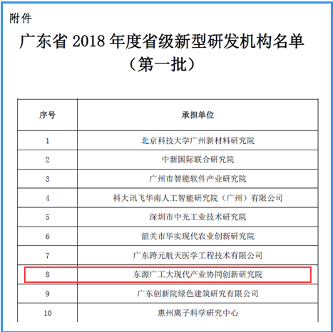 本网讯 近日,东源广工大现代产业协同创新研究院(以下简称研究院)获批广东省高水平新型研发机构建设的立项并获得专项资金800万。